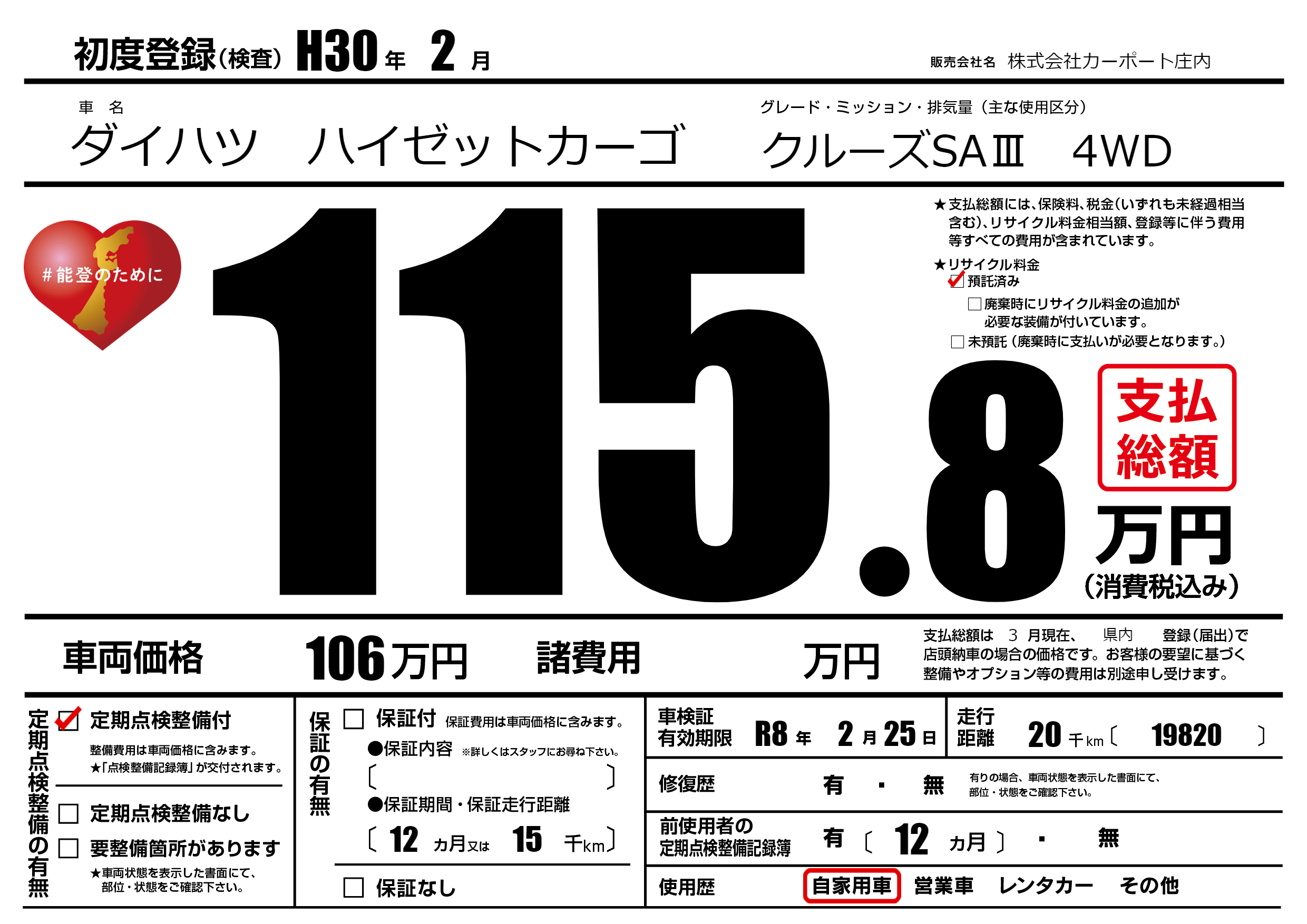 | 車名 | ダイハツ ハイゼットカーゴ | グレード ミッション 排気量 |