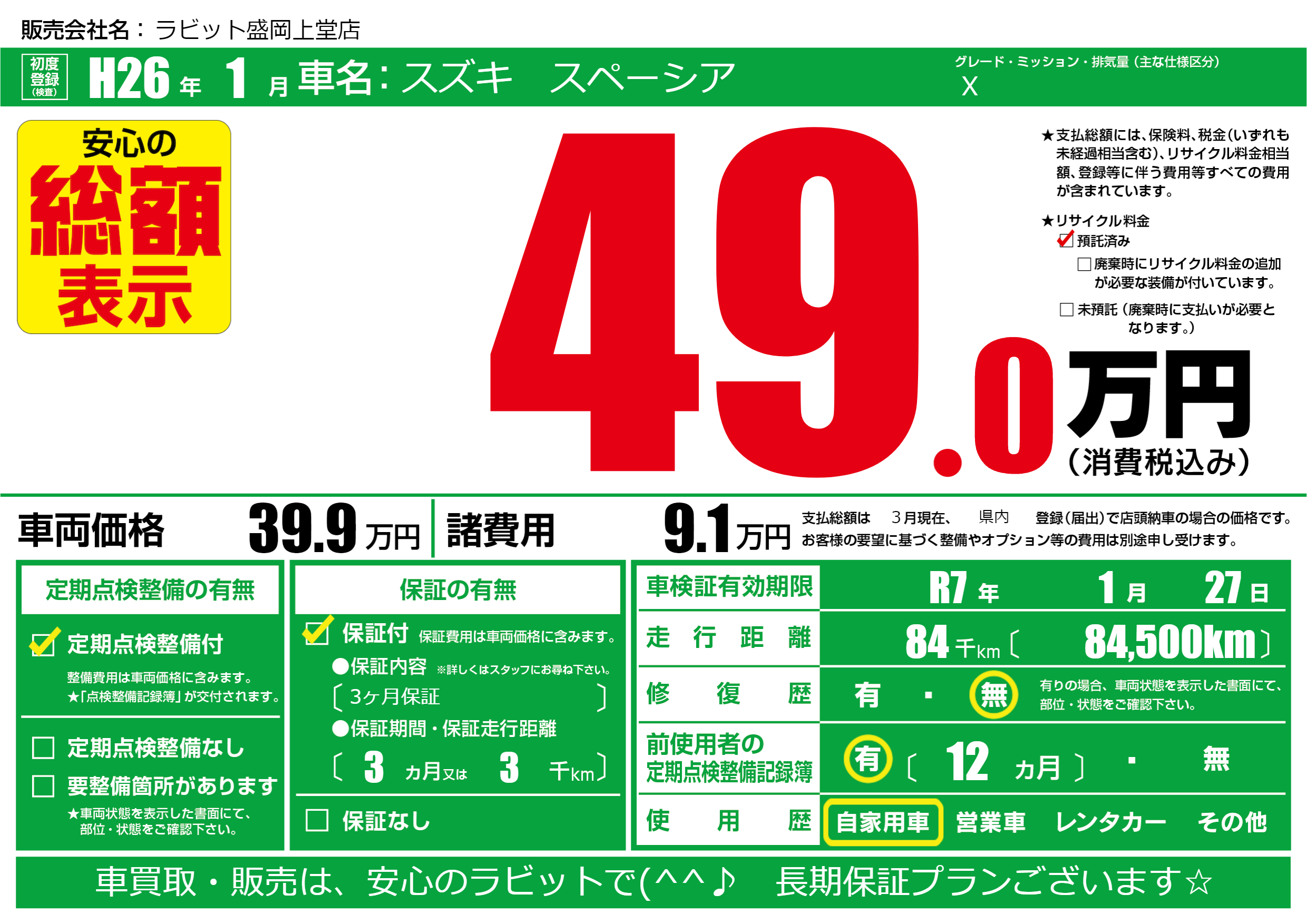 | 走行キロ | 8.4万km | 初年度登録 | H26年1月 |