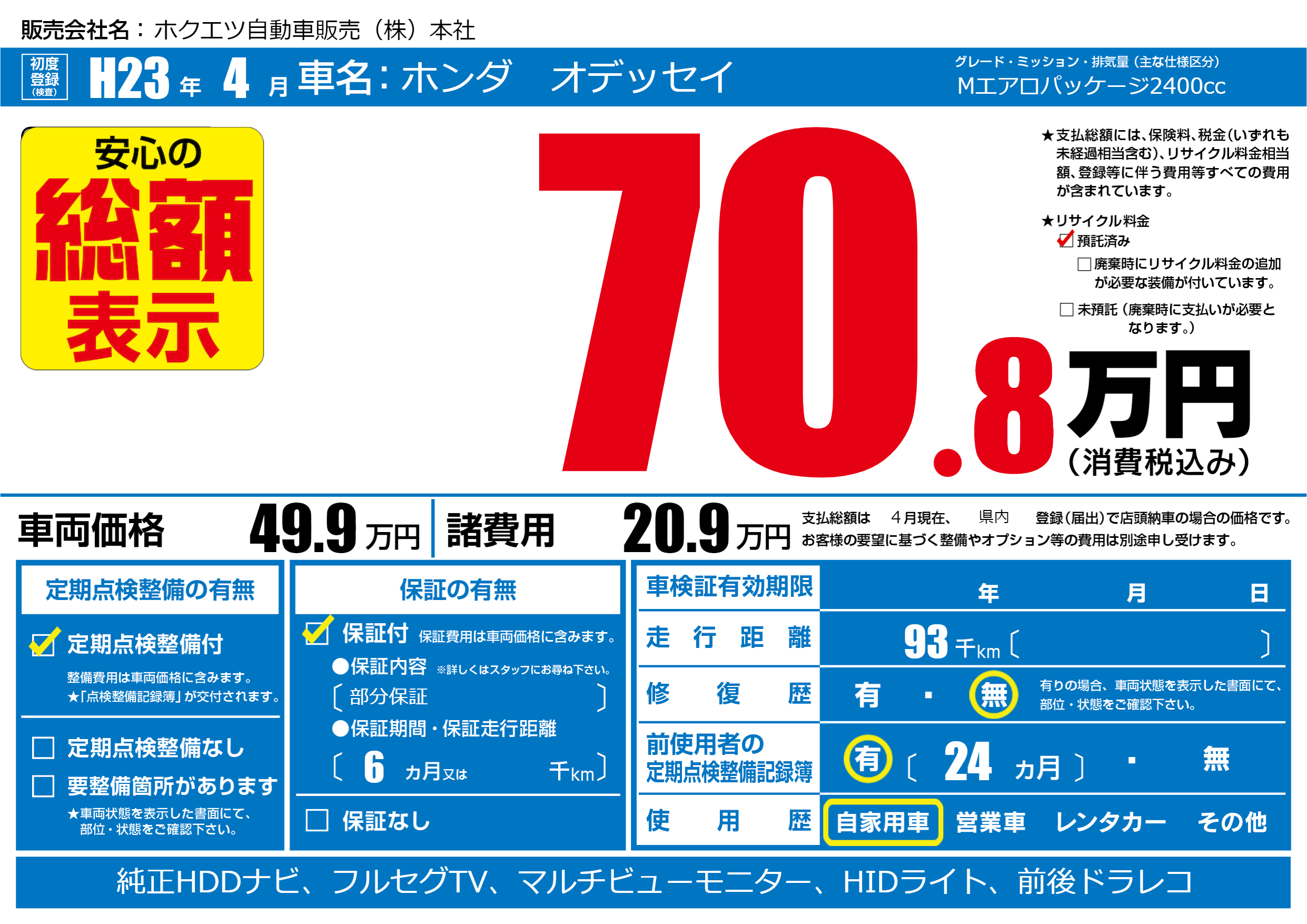 | 車名 | ホンダ オデッセイ | グレード ミッション 排気量 |