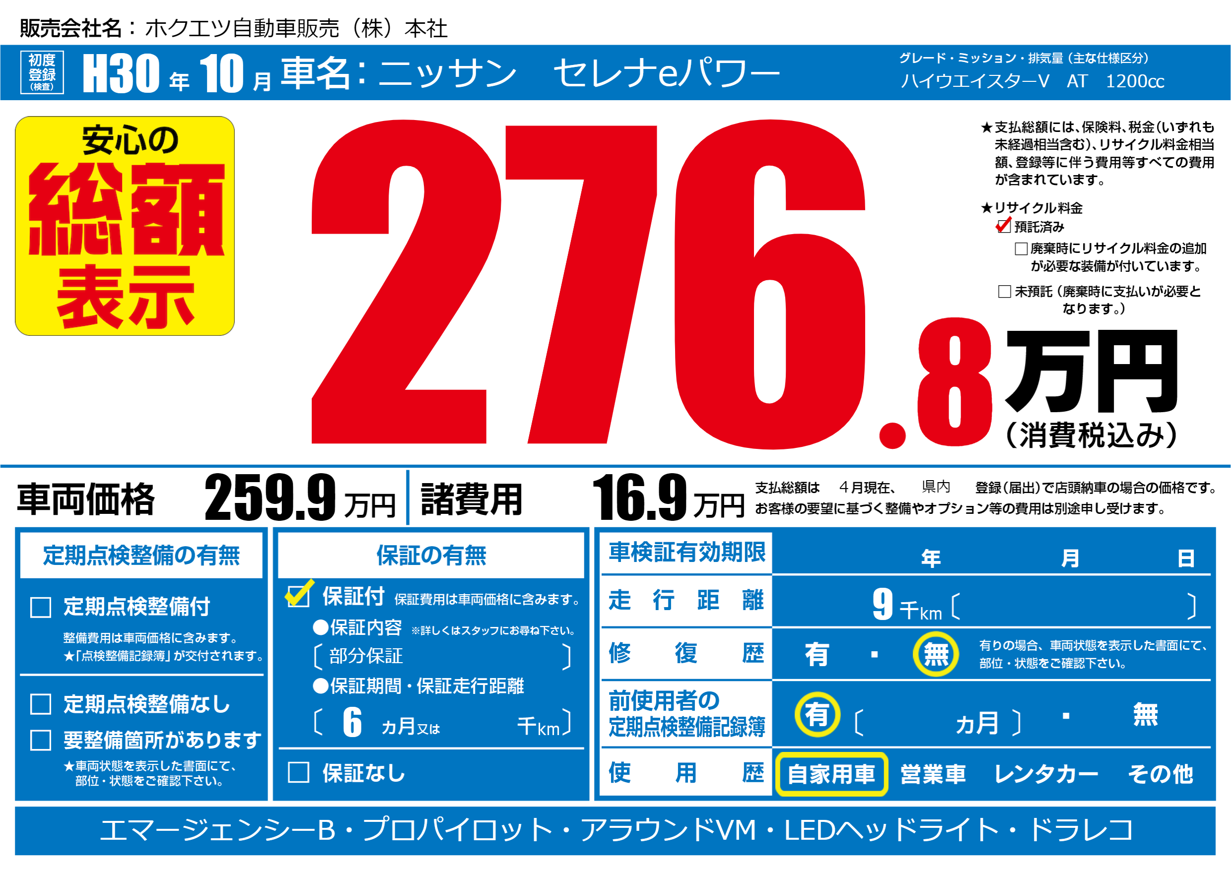 | 車名 | ニッサン セレナeパワー | グレード ミッション 排気量 |