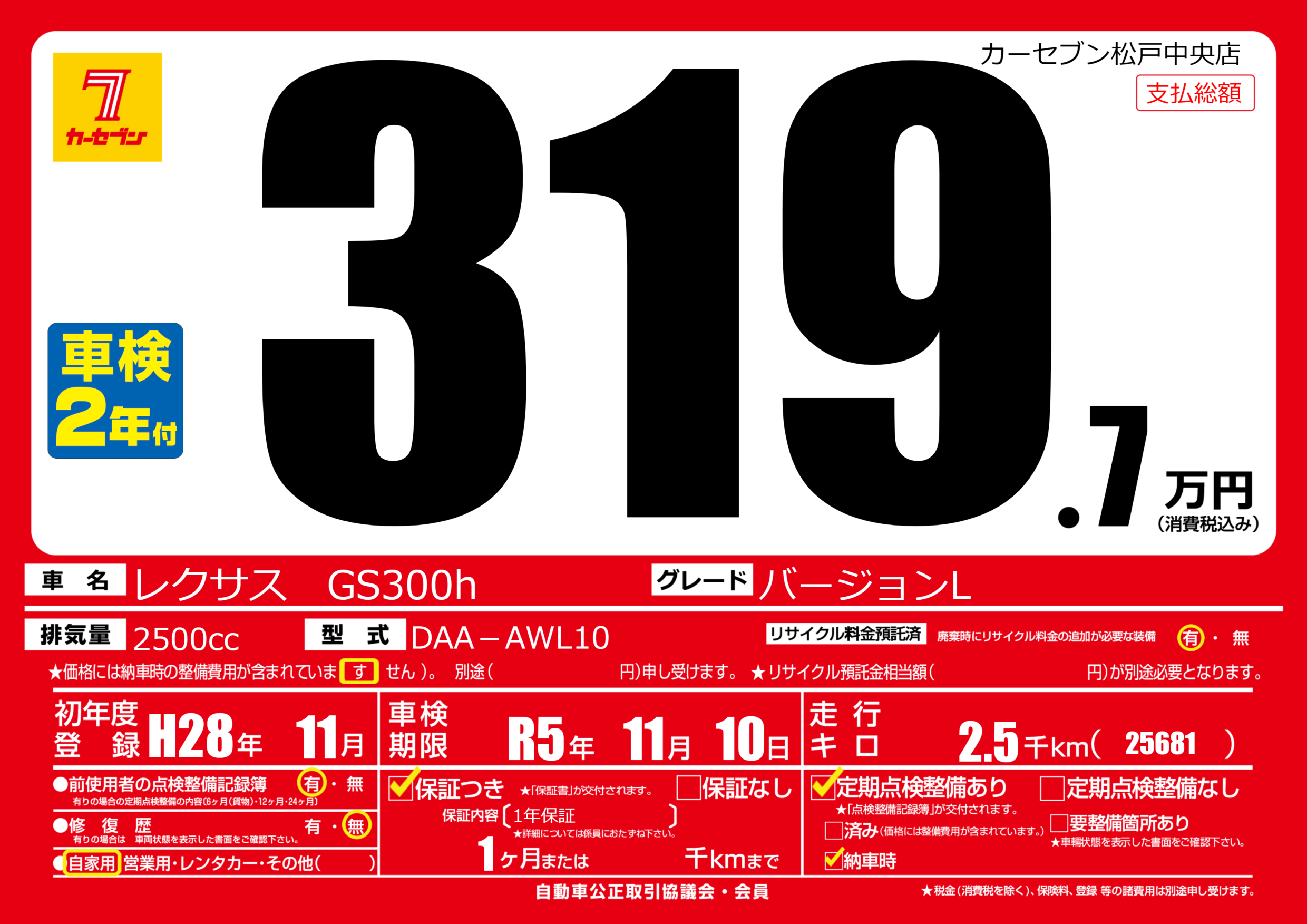 | 車名 | レクサス GS300h | グレード ミッション 排気量 |