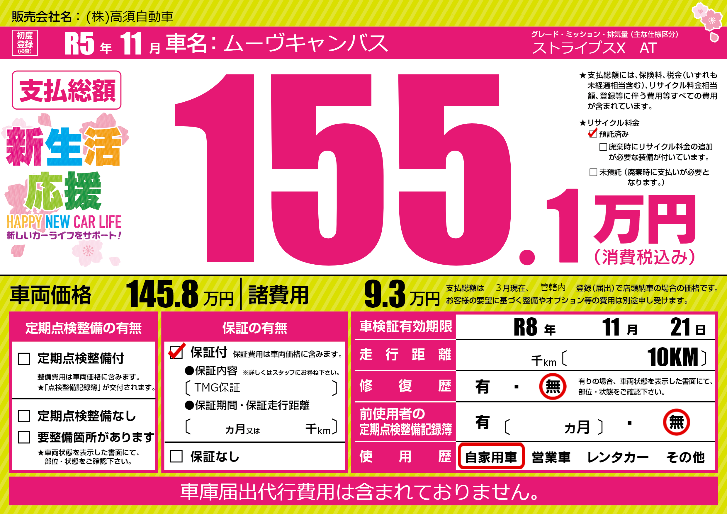 保証付き 保証内容(TMG保証) ---ヶ月または()千kmまで |