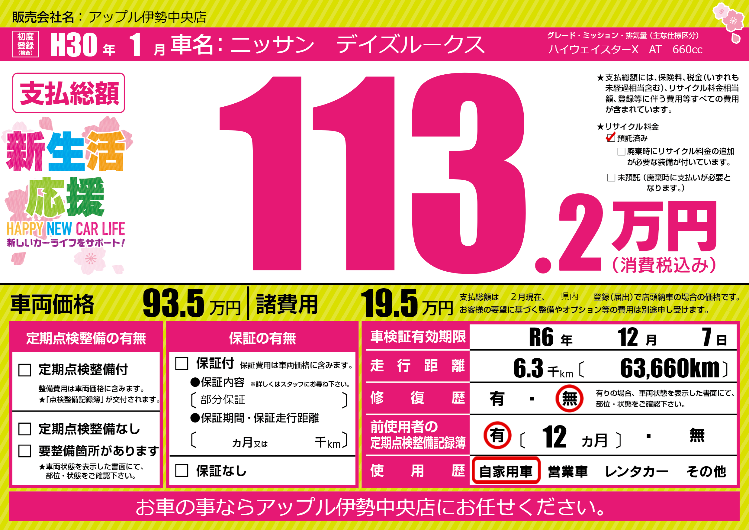 | 車名 | ニッサン デイズルークス | グレード ミッション 排気量 |