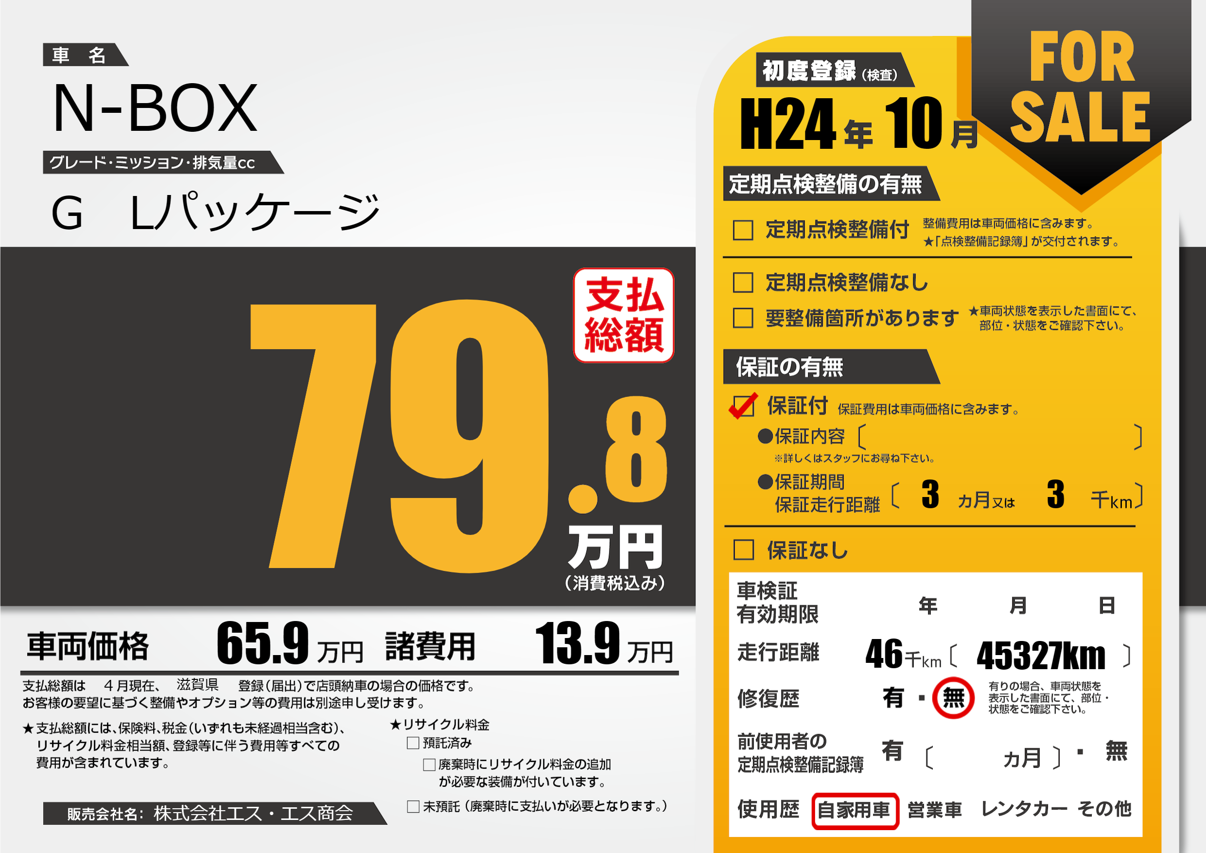 | 走行キロ | 4.6万km | 初年度登録 | H24年10月 |