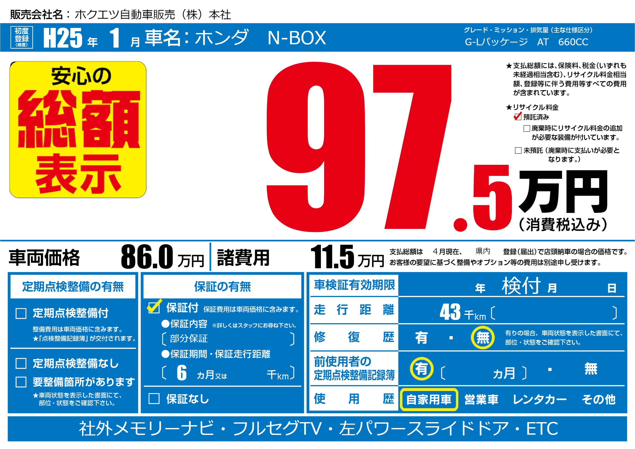| 車名 | ホンダ N-BOX | グレード ミッション 排気量 |