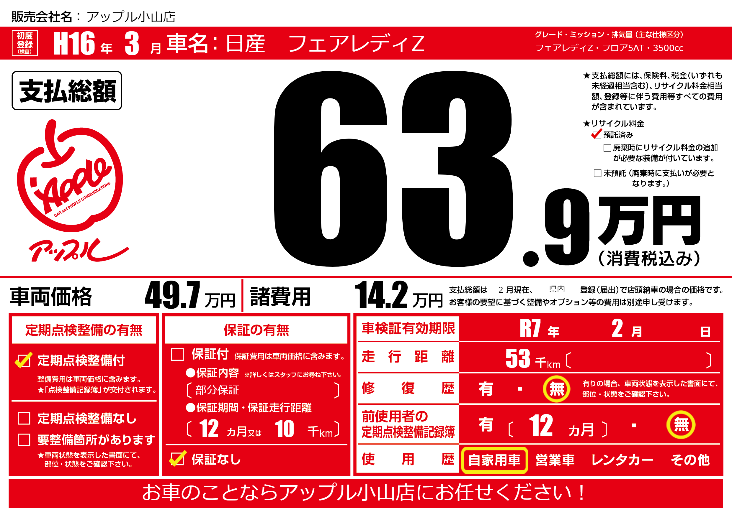 | 走行キロ | 5.3万km | 初年度登録 | H16年3月 |
