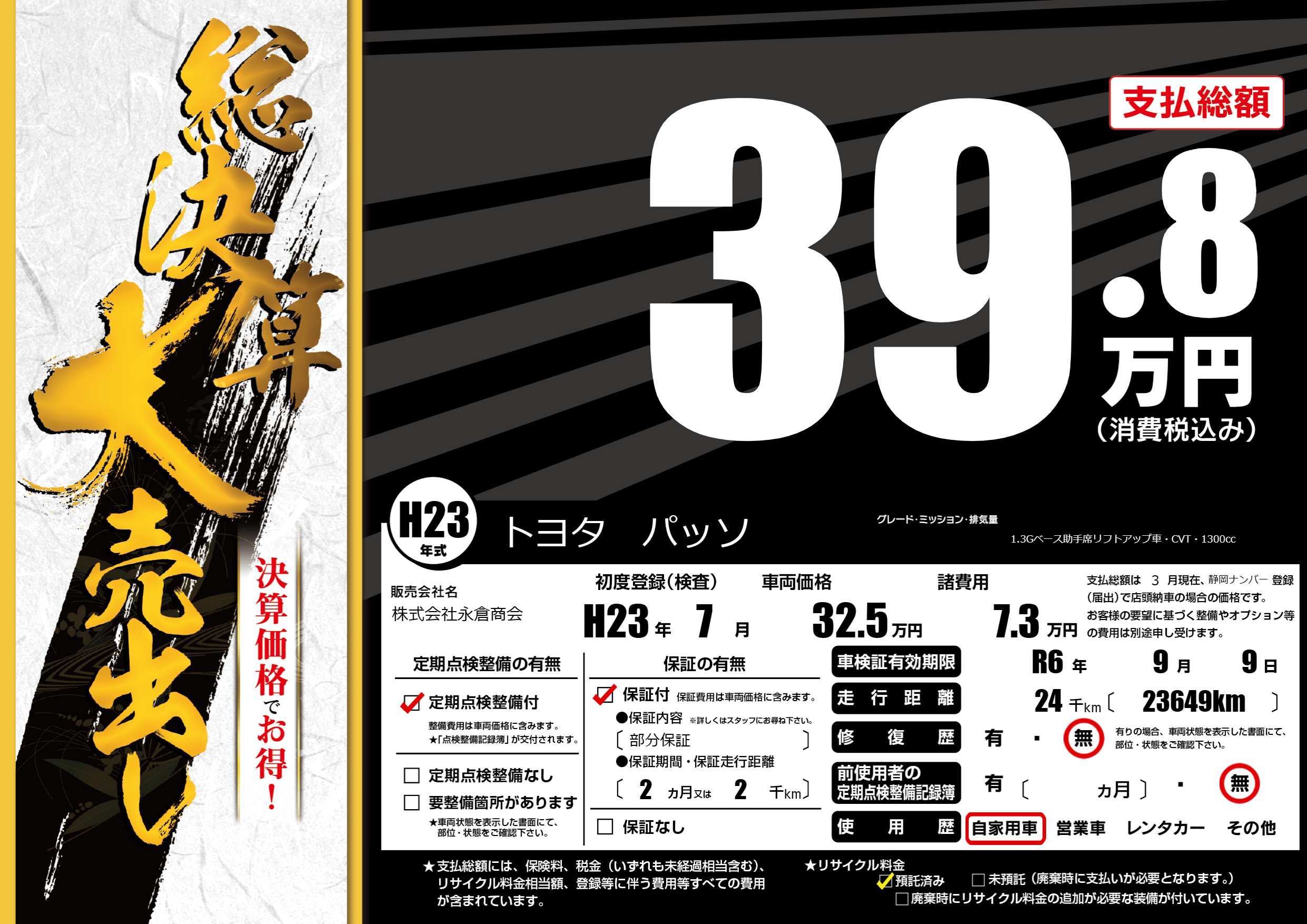 | 車名 | トヨタ パッソ | グレード ミッション 排気量 |