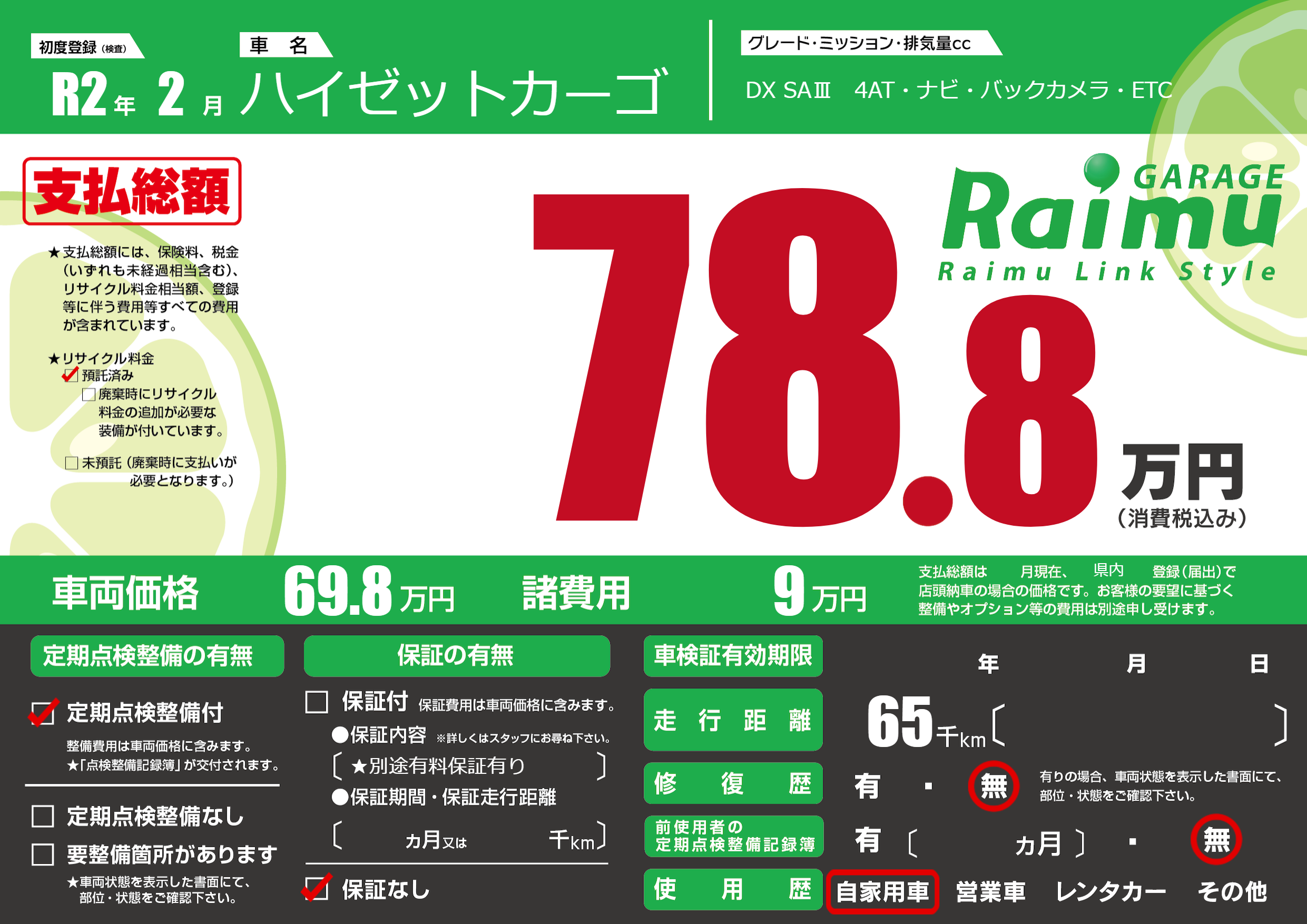 | 車名 | ハイゼットカーゴ | グレード ミッション 排気量 |
