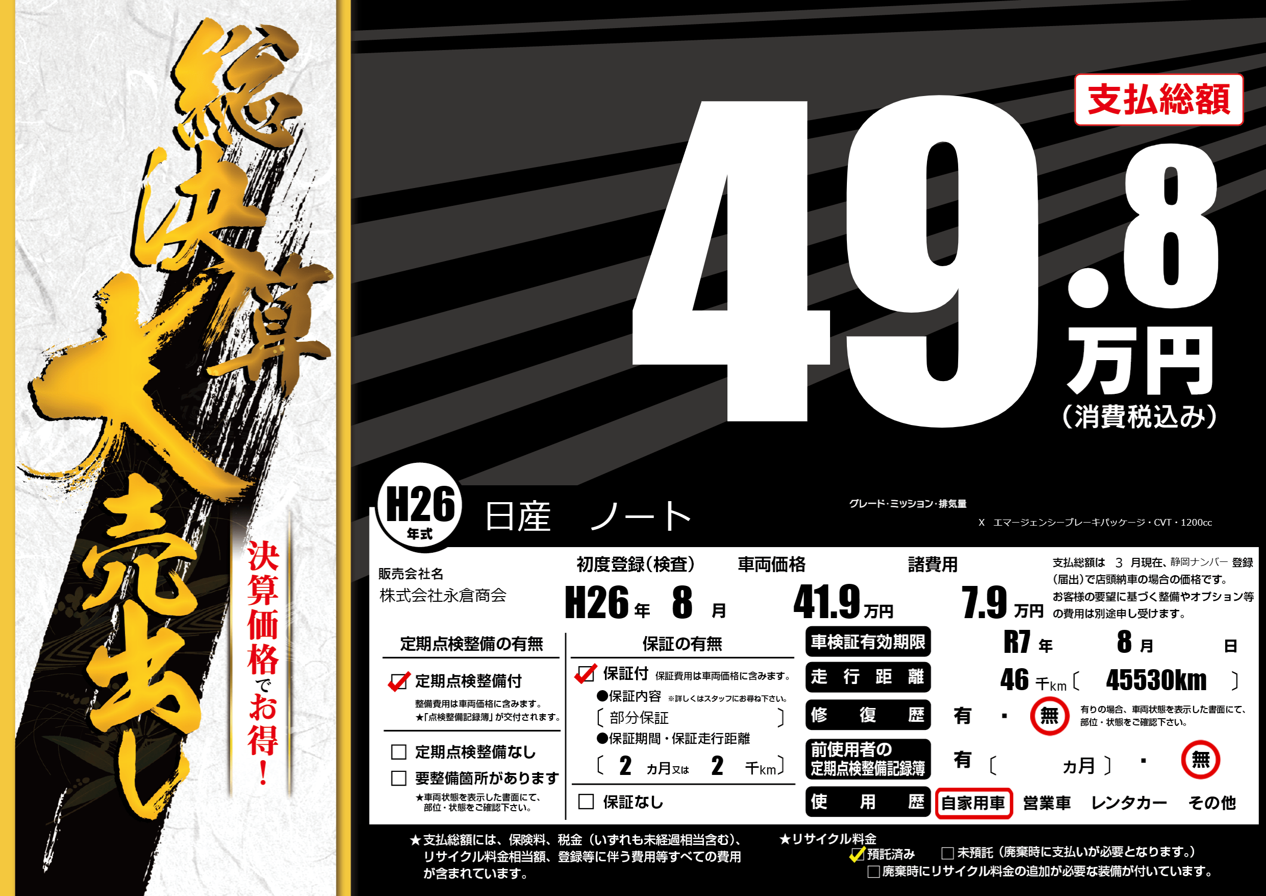 | 車名 | 日産 ノート | グレード ミッション 排気量 |