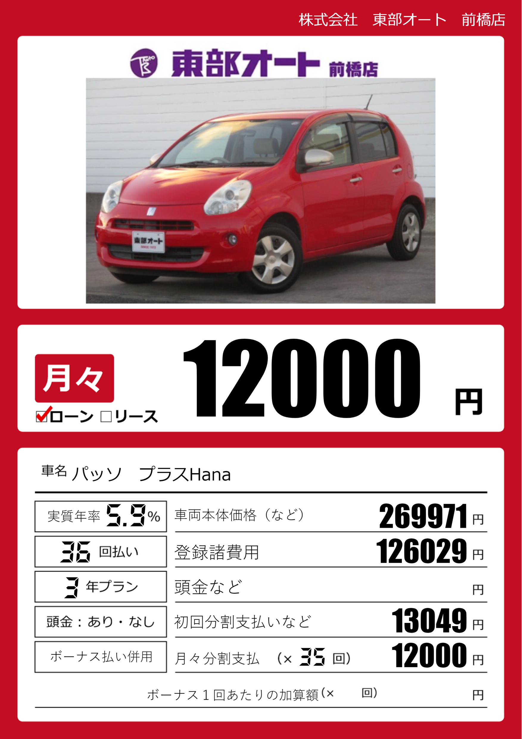 | 車名 | パッソ プラスHana | グレード ミッション 排気量 |