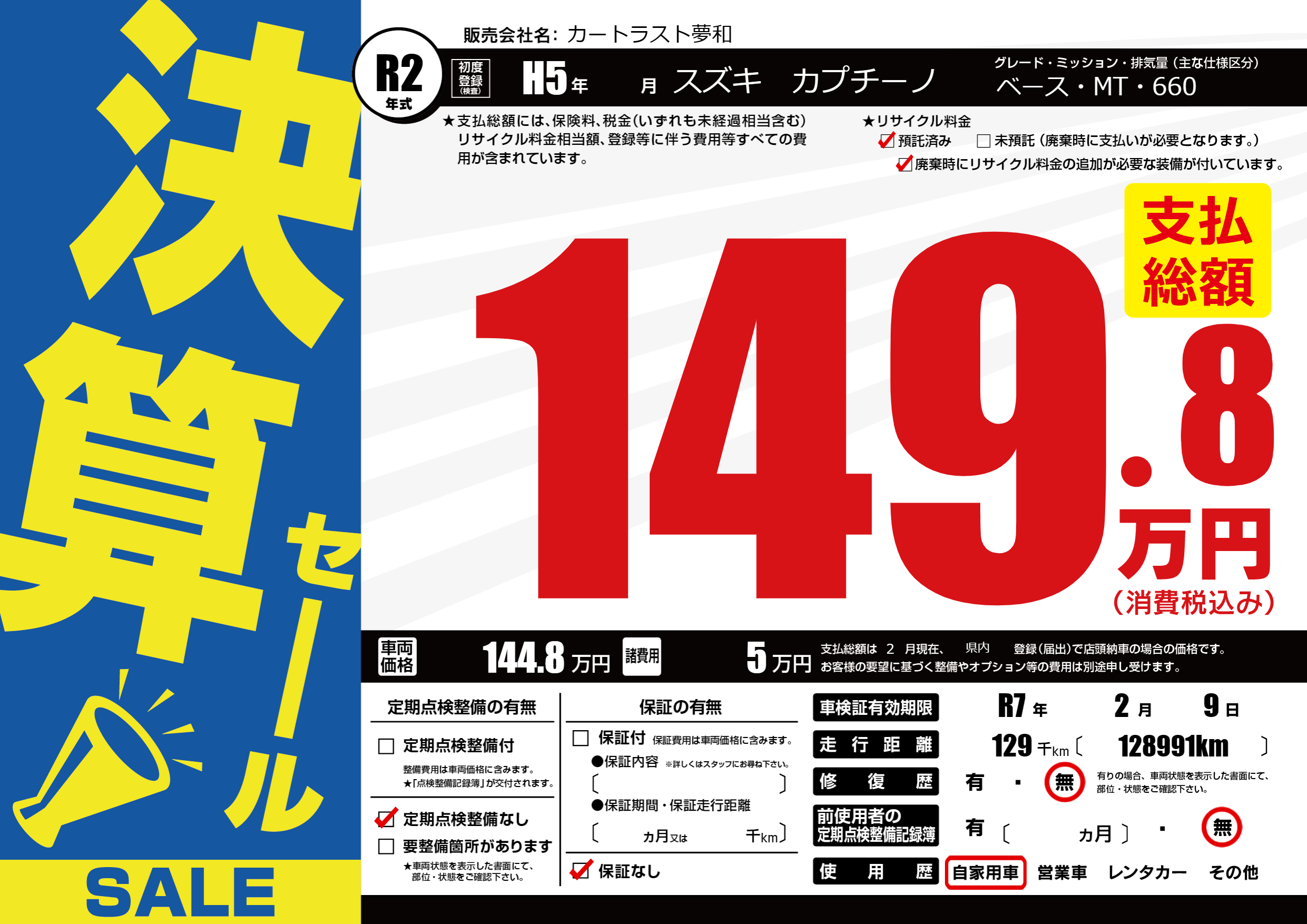 | 走行キロ | 12.9万km | 初年度登録 | H5年---月 |