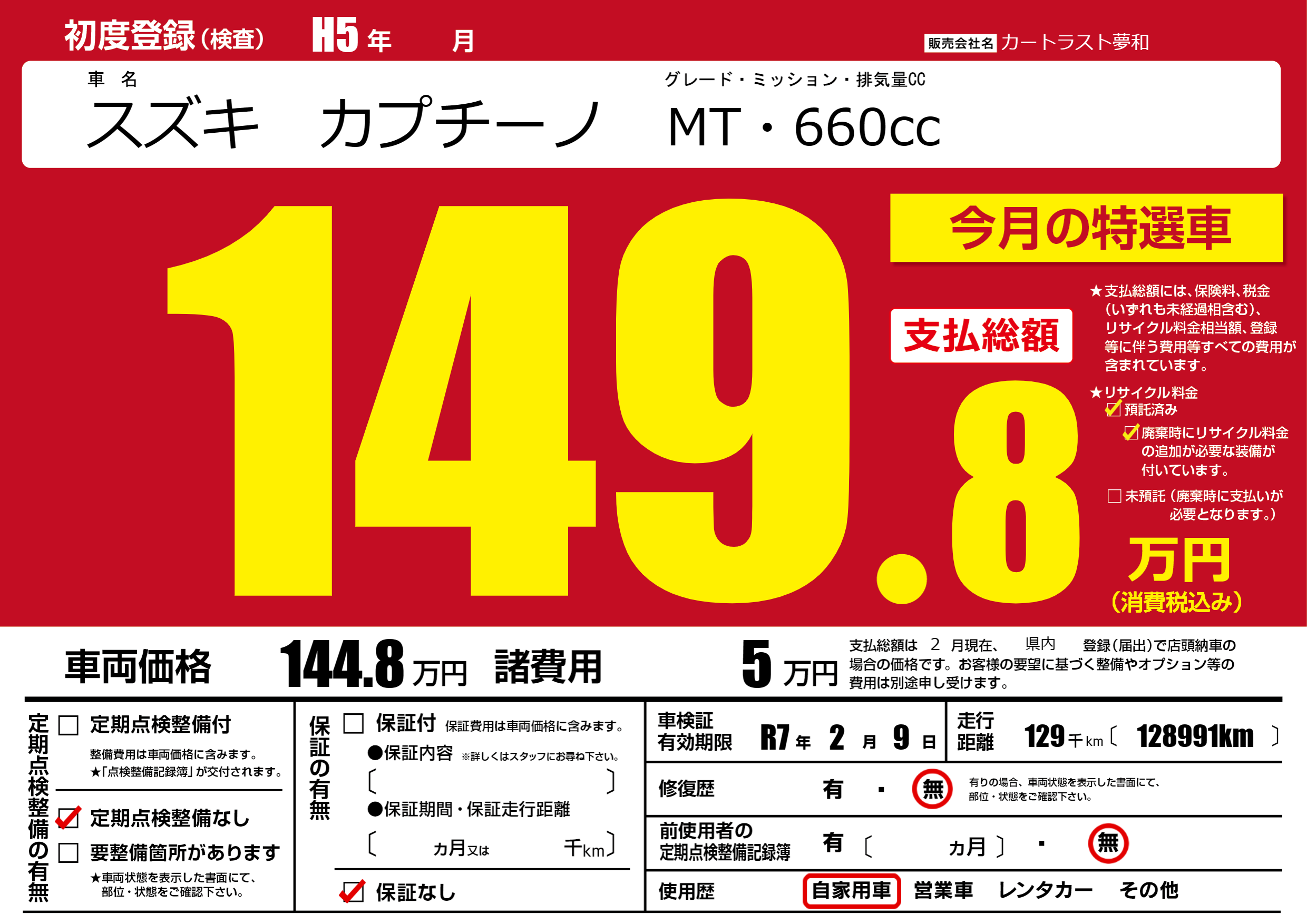 | 車検制限 | R7年 2月 9日 | ||