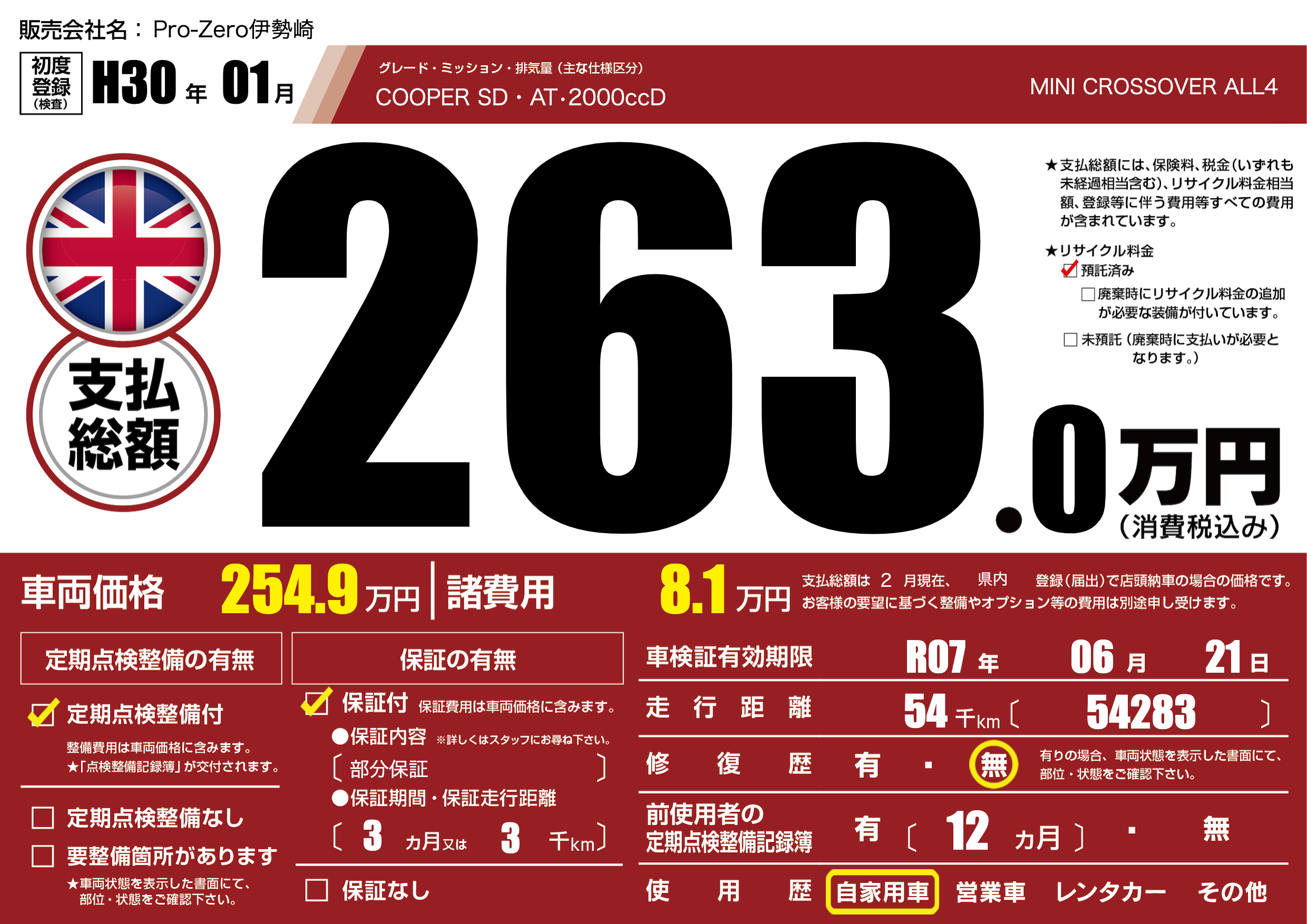 | 車名 | MINI CROSSOVER ALL4 | グレード ミッション 排気量 |