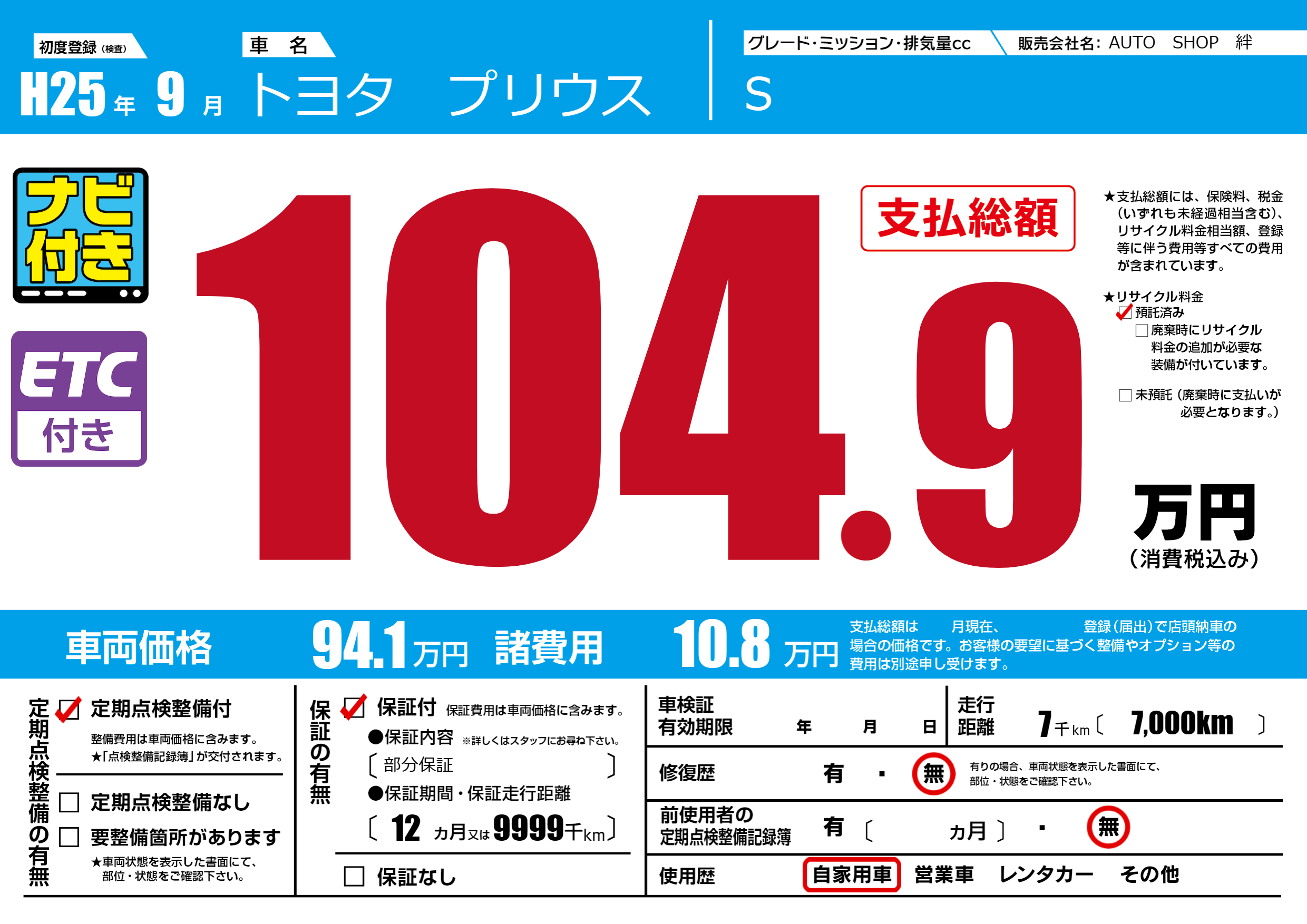 | 車名 | トヨタ プリウス | グレード ミッション 排気量 |