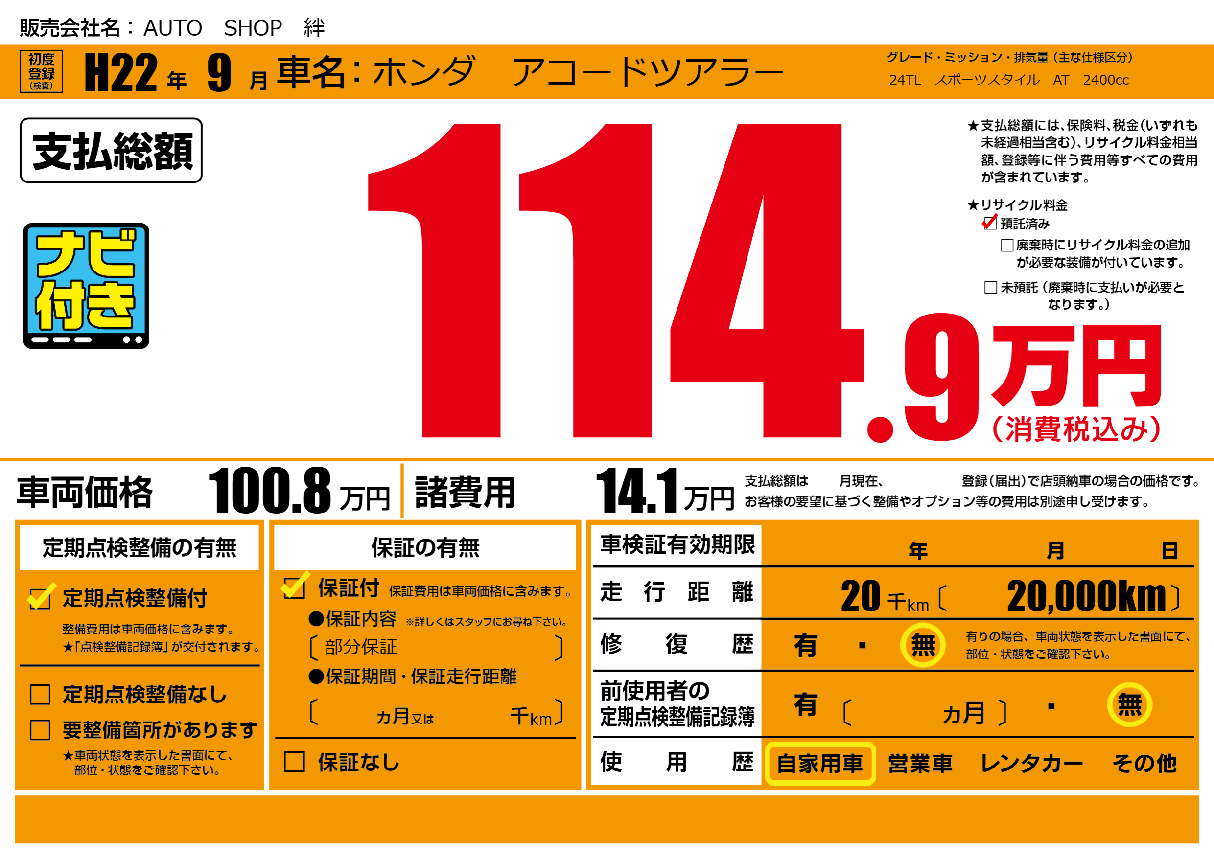| 走行キロ | 2万km | 初年度登録 | H22年9月 |