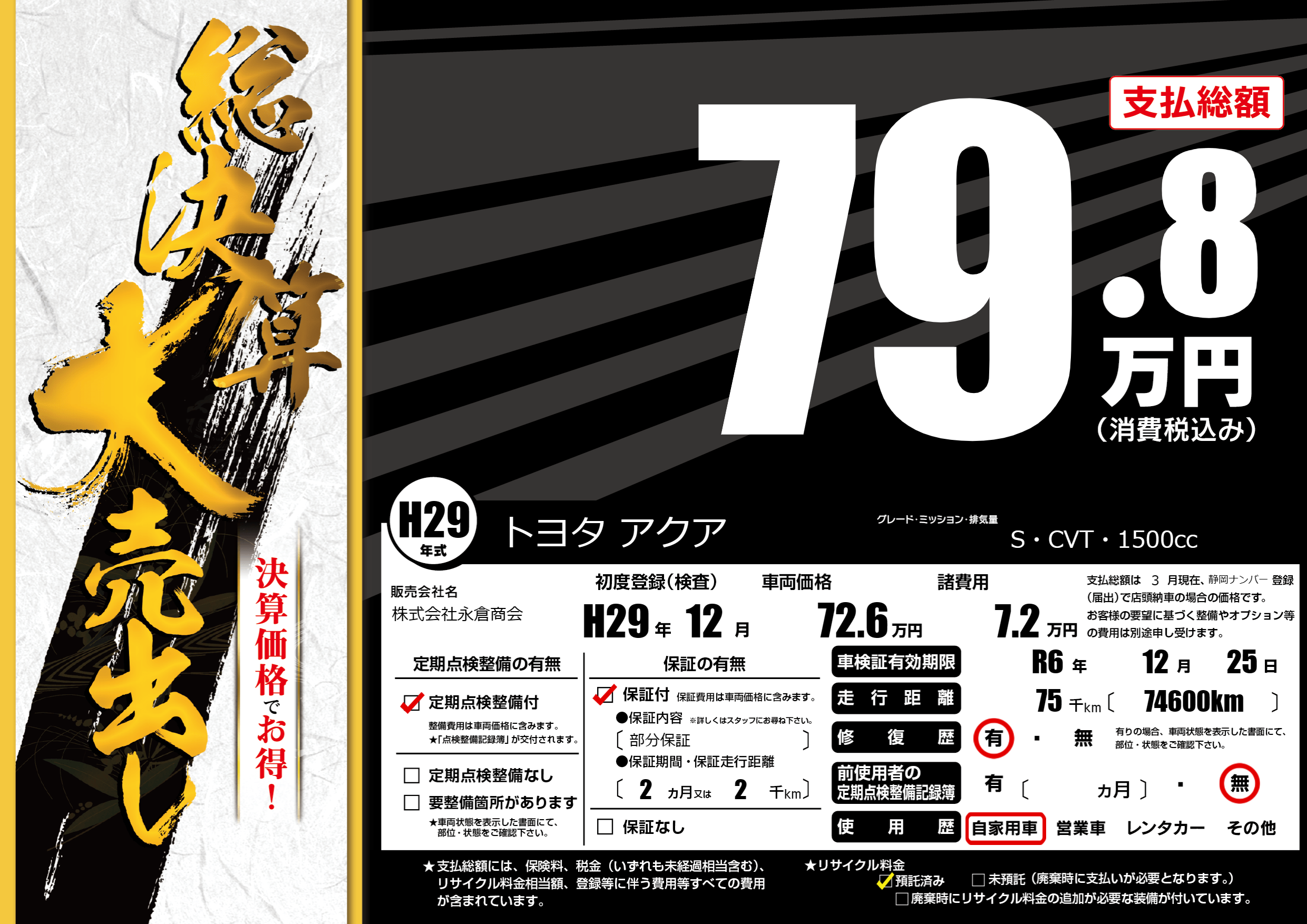 | 車名 | トヨタ アクア | グレード ミッション 排気量 |