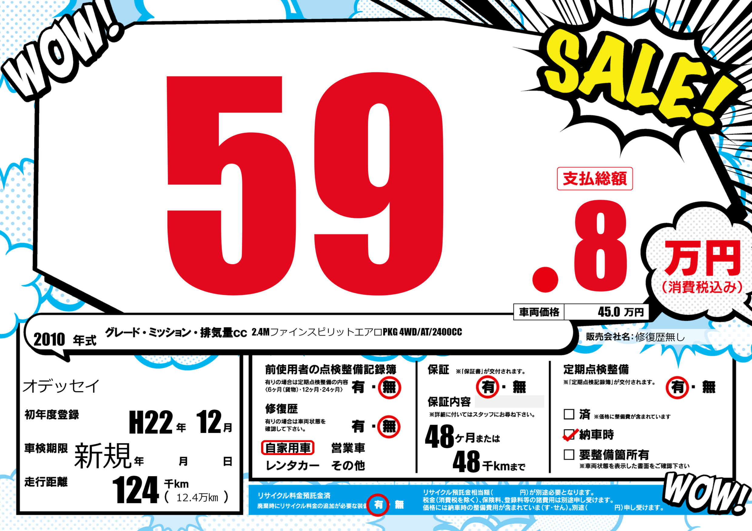 | 走行キロ | 12.4万km | 初年度登録 | H22年12月 |
