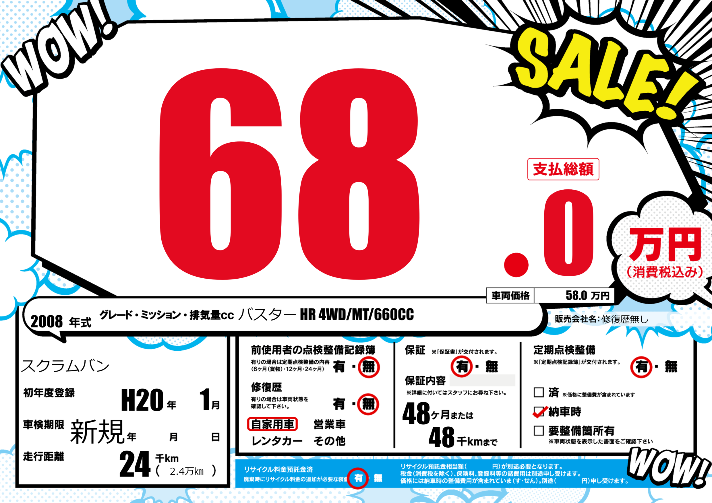 | 走行キロ | 2.4万km | 初年度登録 | H20年1月 |