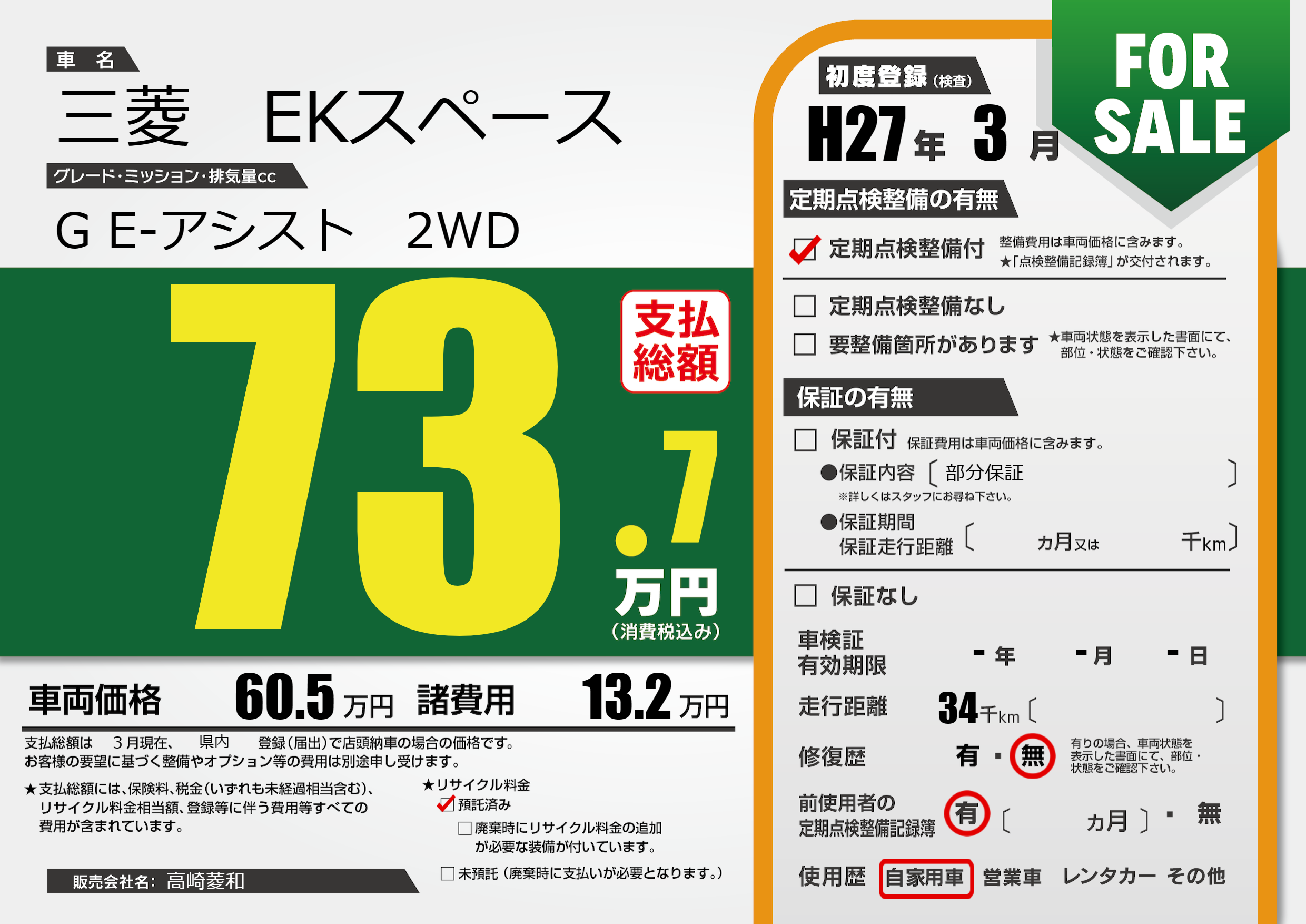 | 車名 | 三菱 EKスペース | グレード ミッション 排気量 |