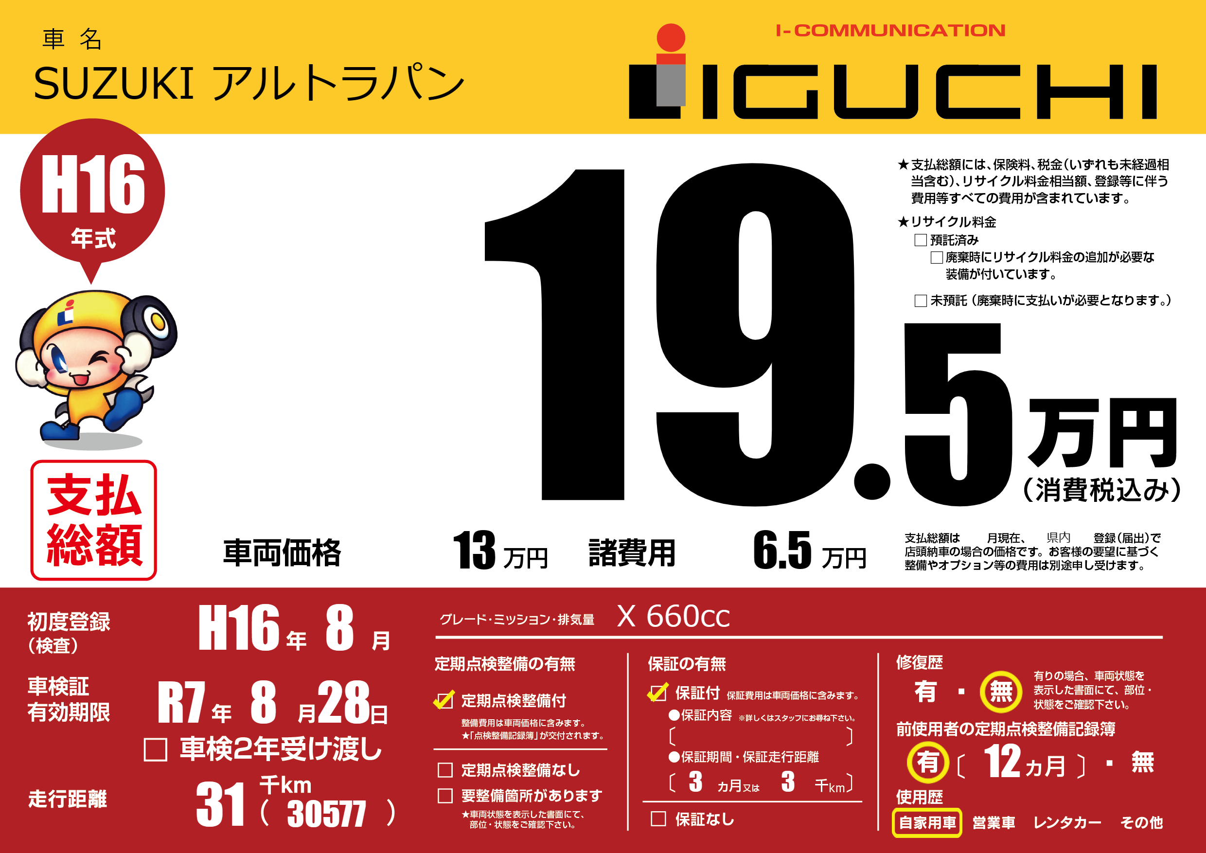| 走行キロ | 3.1万km | 初年度登録 | H16年8月 |