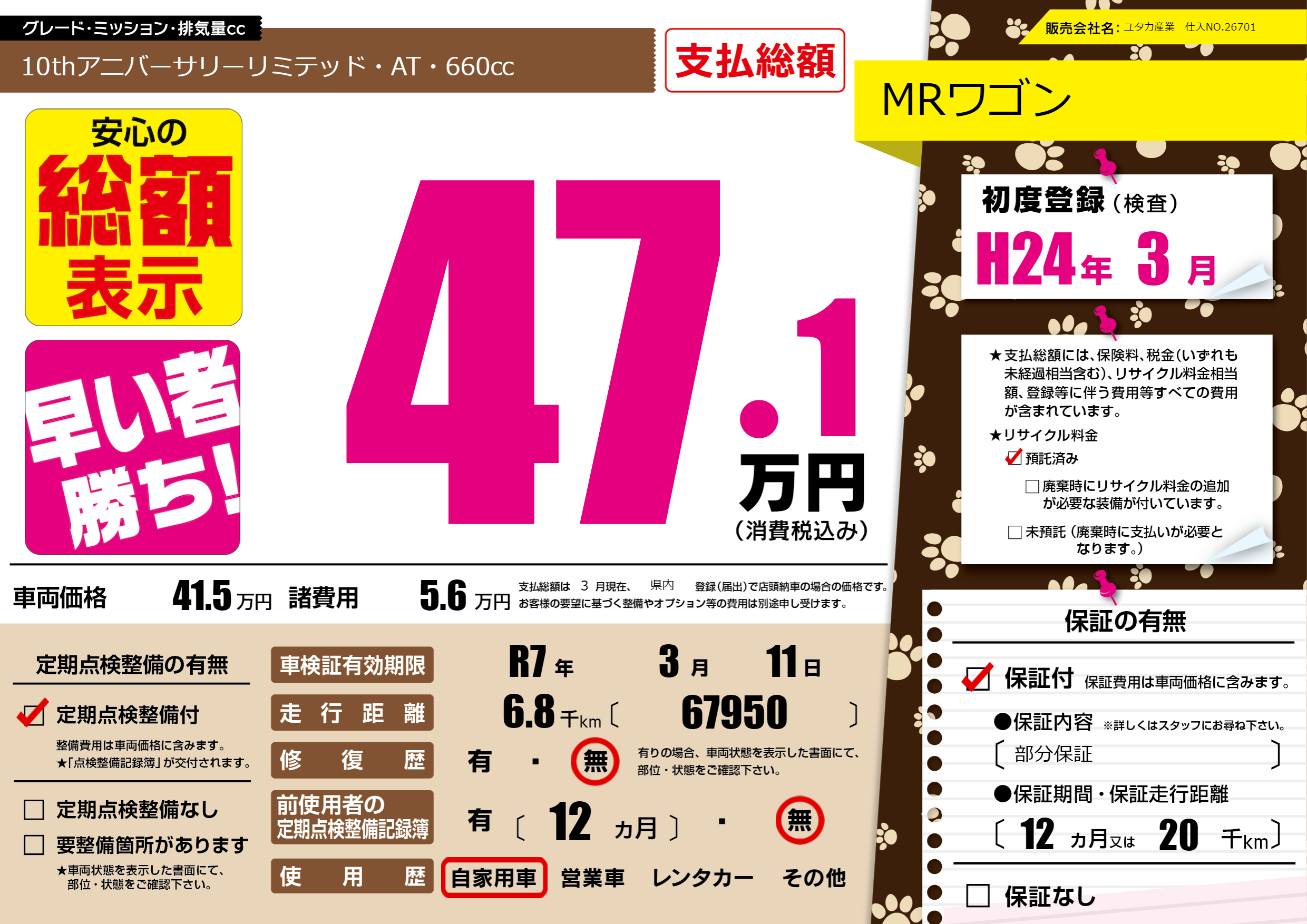 | 車名 | MRワゴン | グレード ミッション 排気量 |
