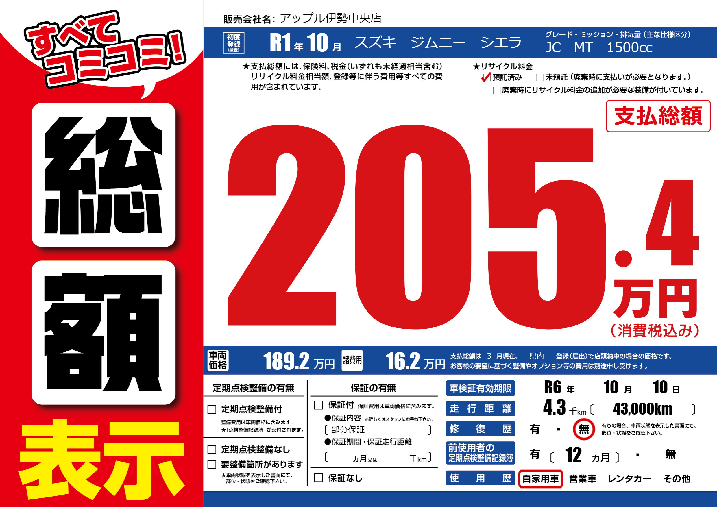 | 車検制限 | R6年 10月 10日 | ||