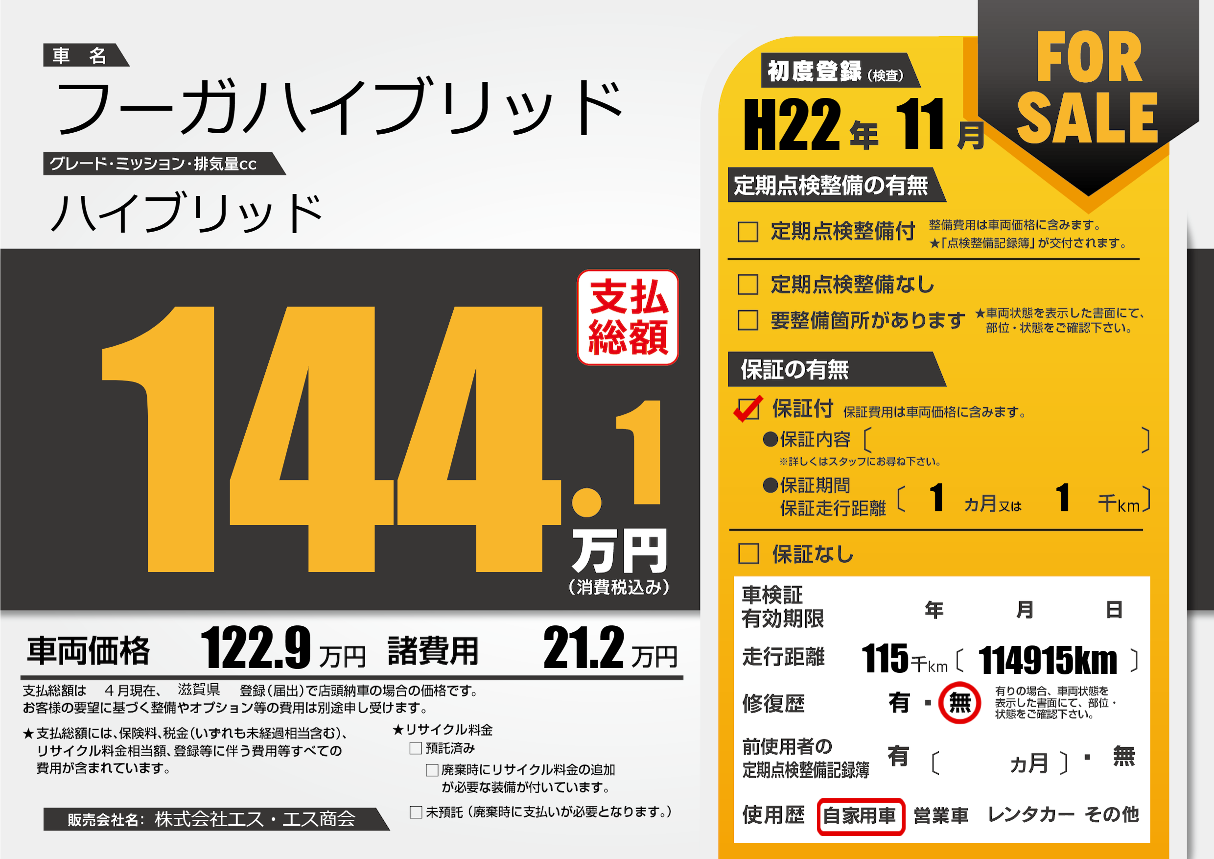 | 走行キロ | 11.5万km | 初年度登録 | H22年11月 |