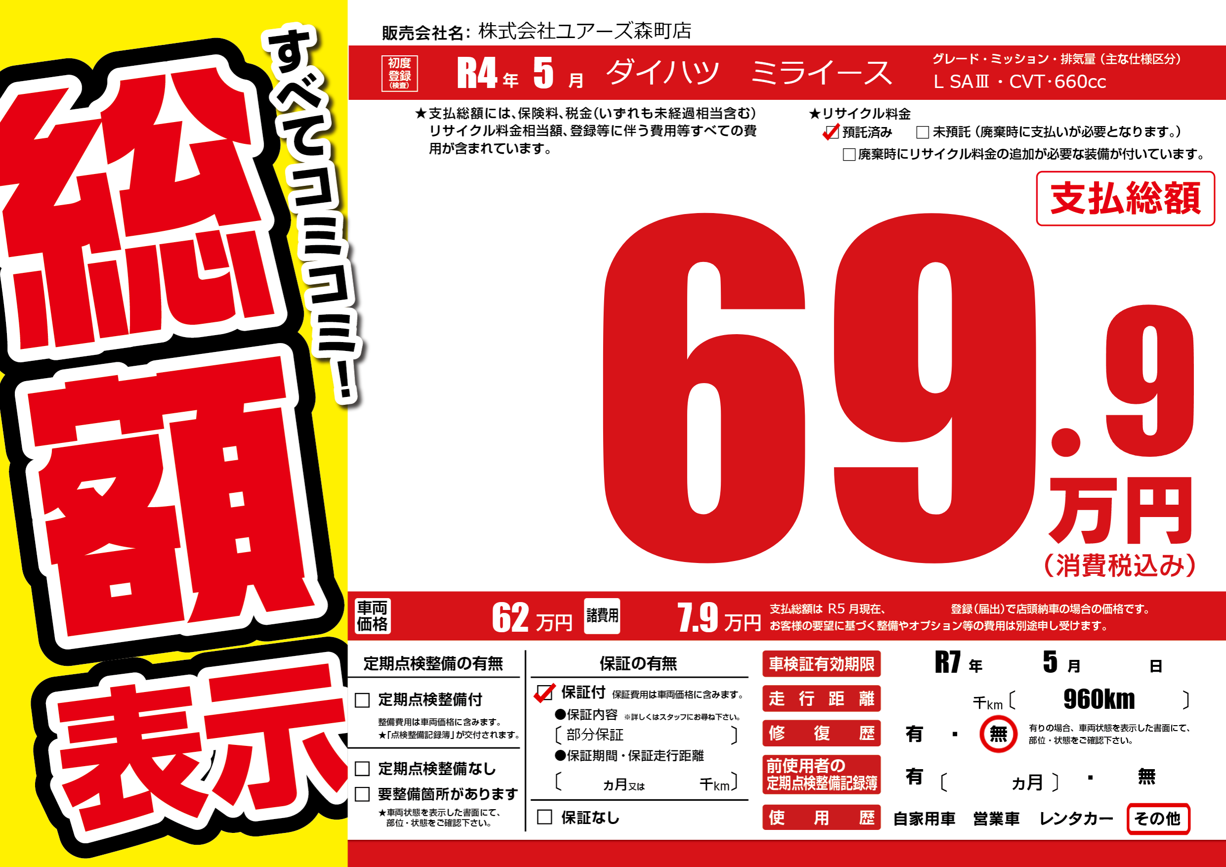 | 走行キロ | - | 初年度登録 | R4年5月 |