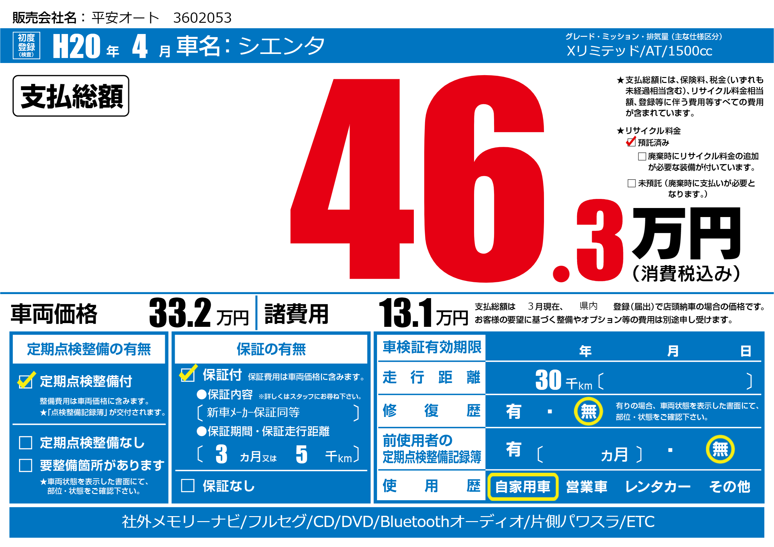 | 車検制限 | - 年 - 月 - 日 | ||