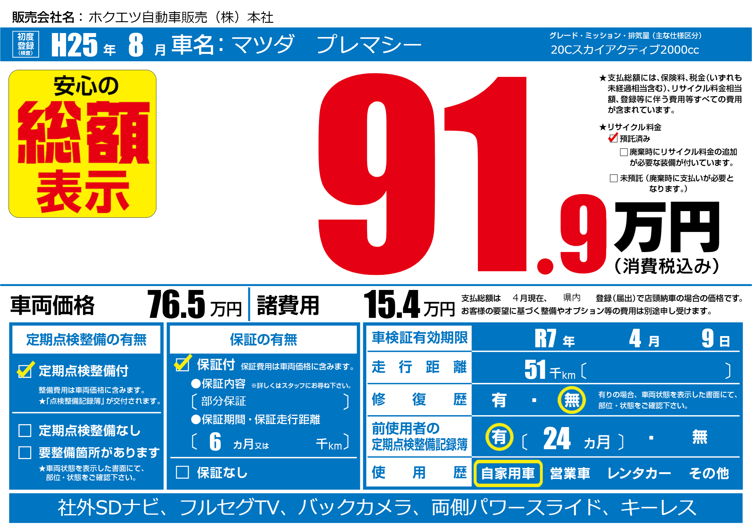| 走行キロ | 5.1万km | 初年度登録 | H25年8月 |