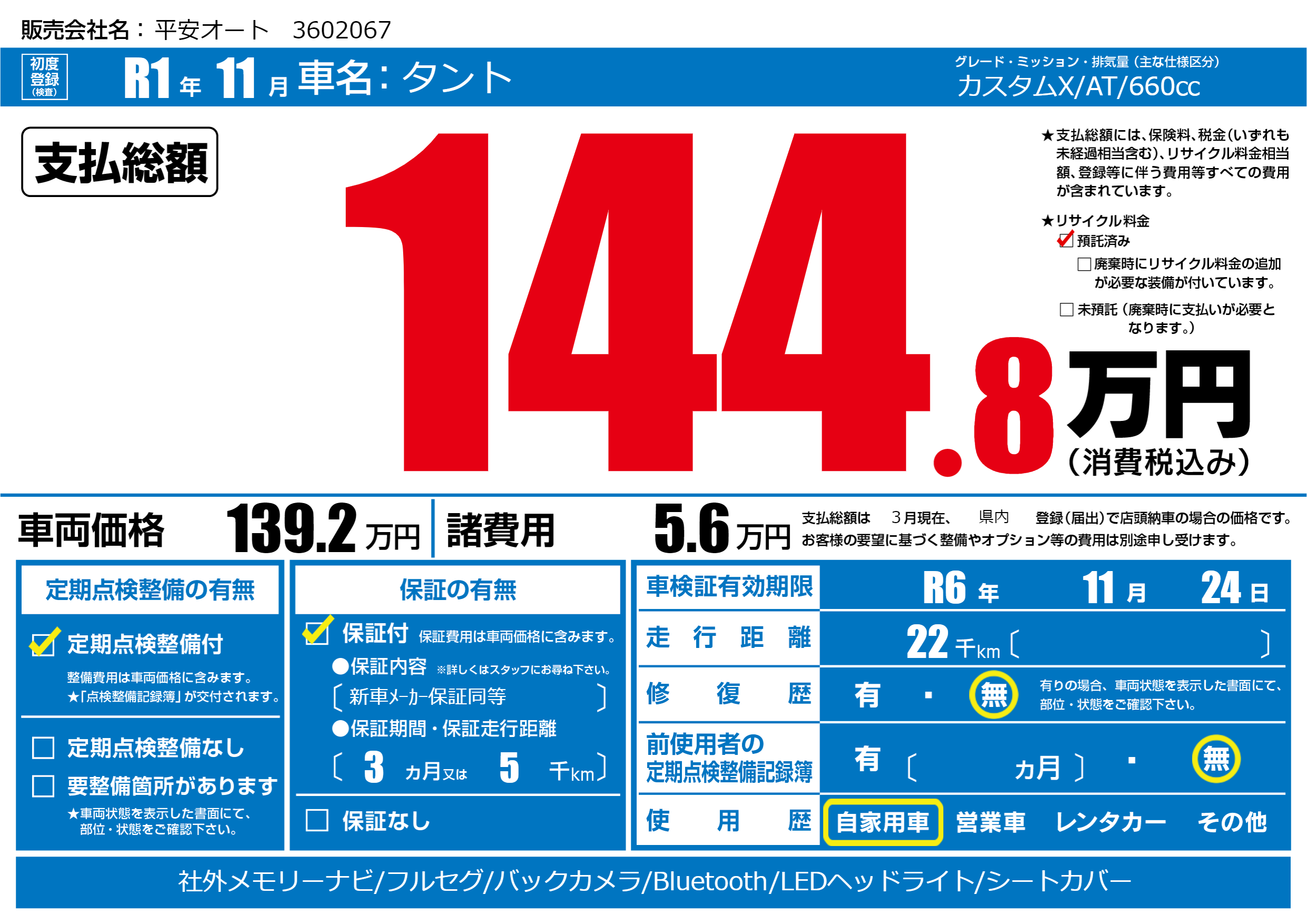 なし | 車検制限 | R6年11月24月 |
