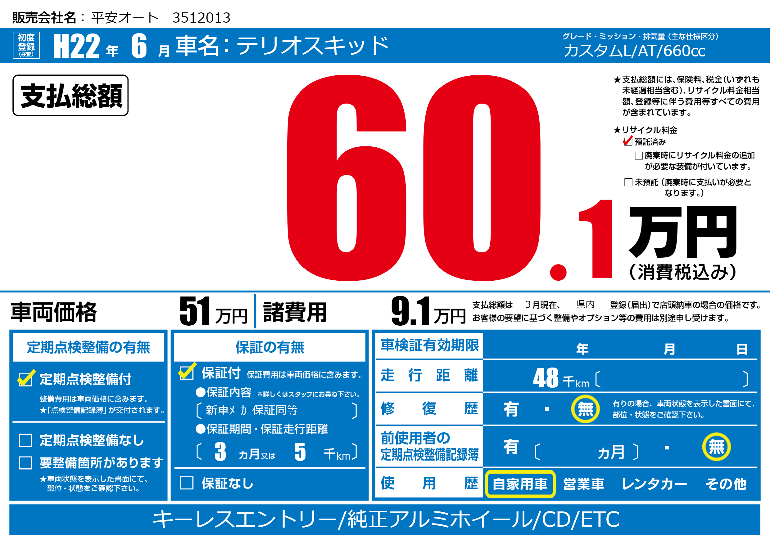 | 走行キロ | 4.8万km | 初年度登録 | H22年6月 |