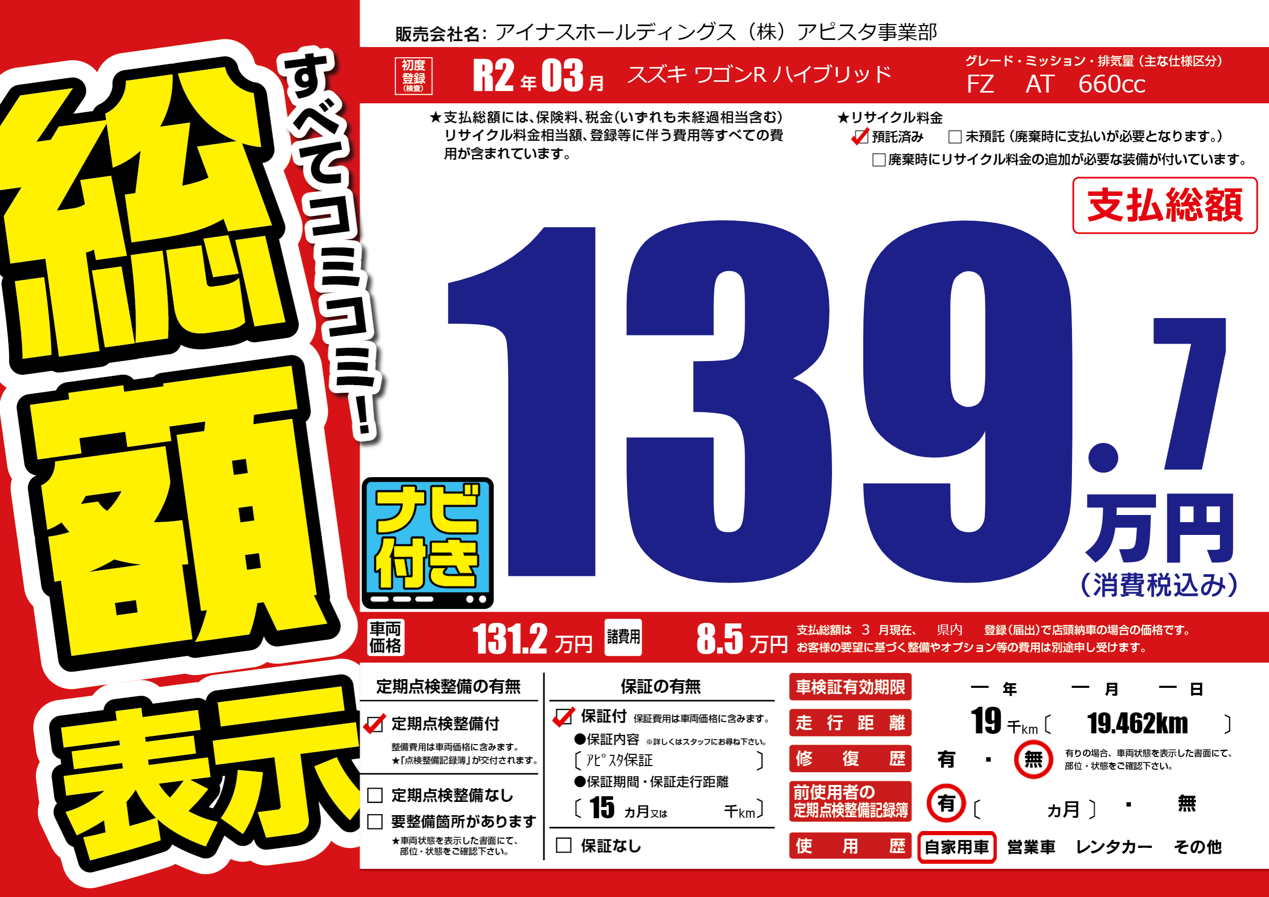 | 車名 | スズキ ワゴンR ハイブリッド | グレード ミッション 排気量 |