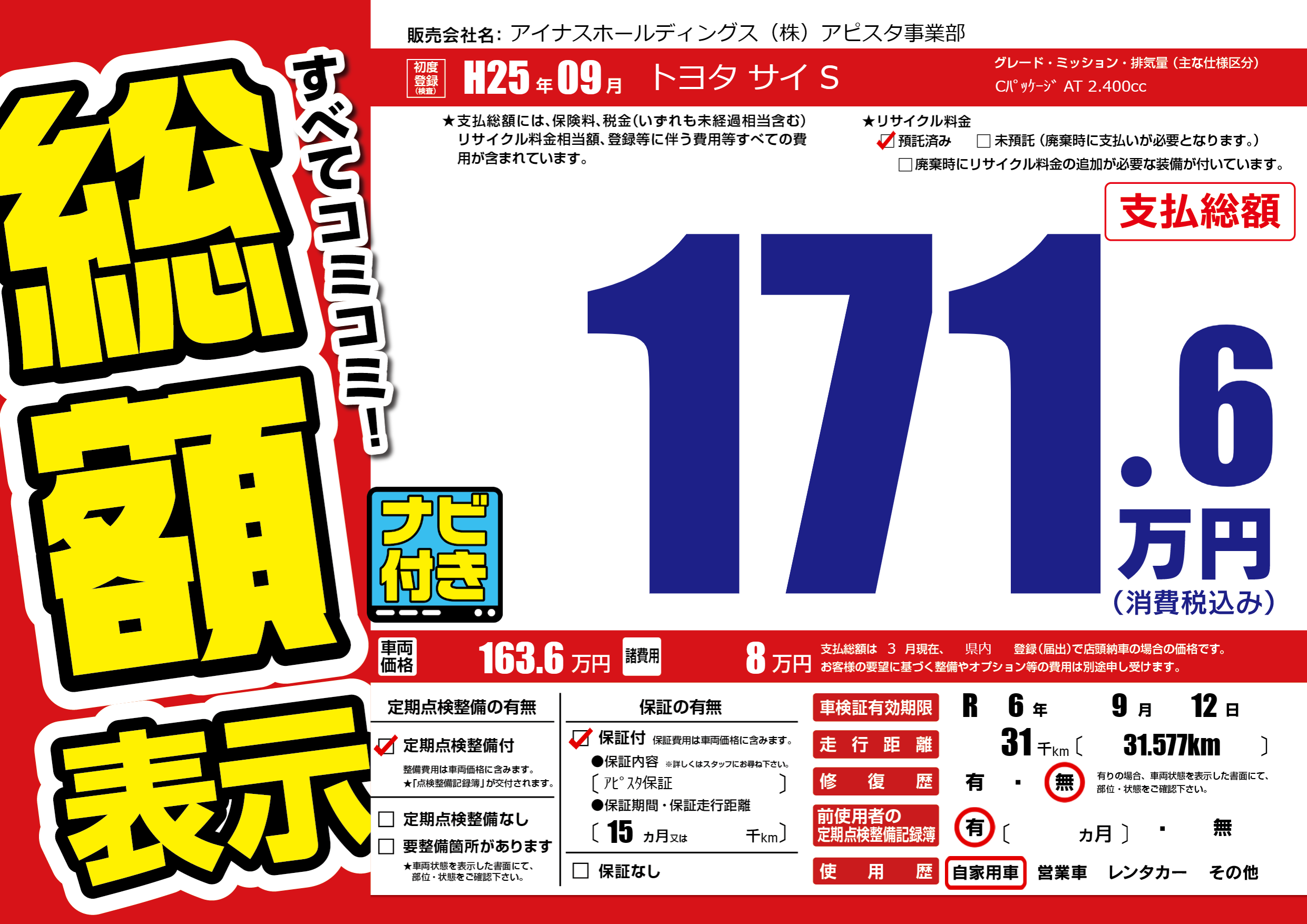 なし | 車検制限 | R 6年9月12月 |