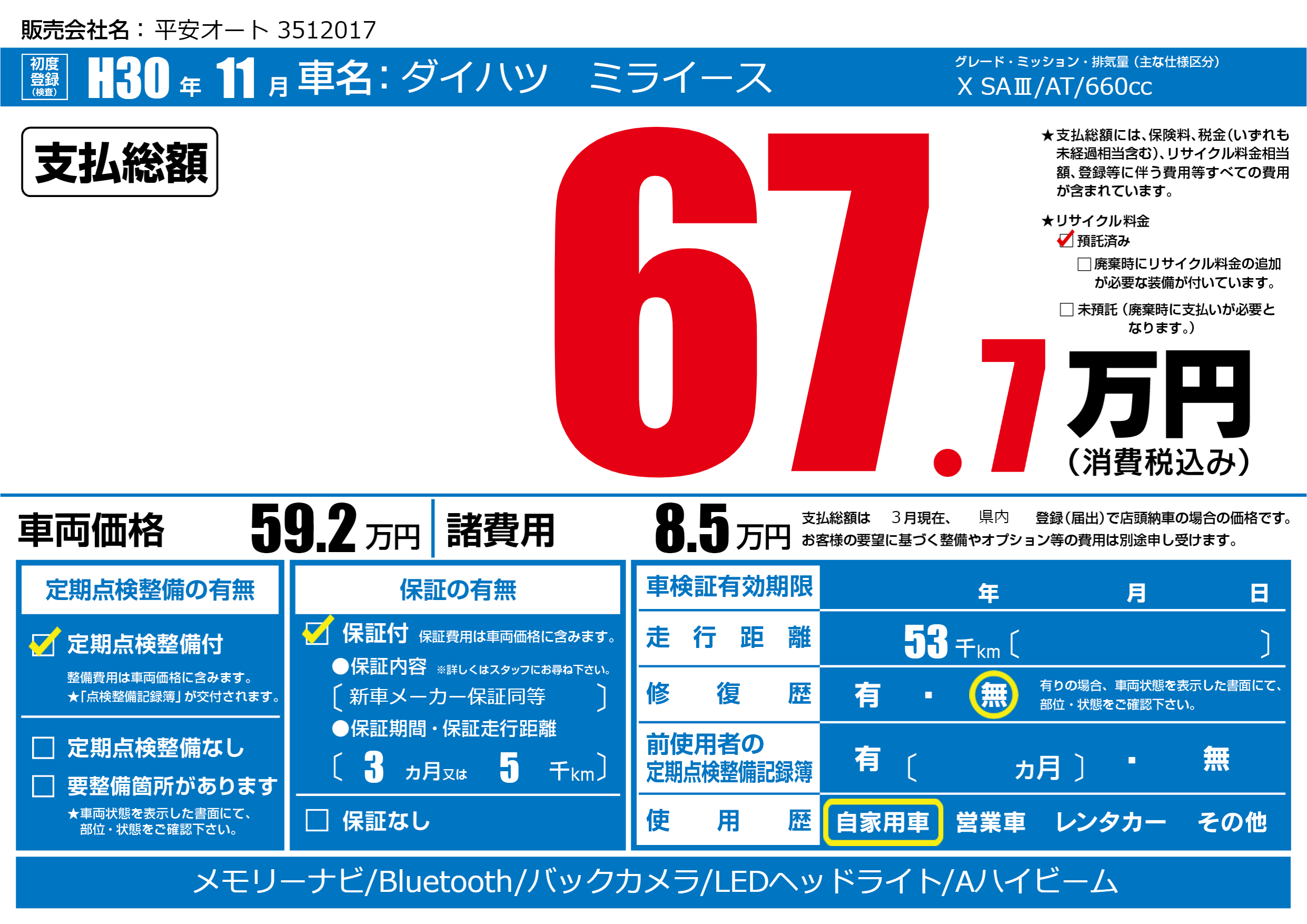 | 車名 | ダイハツ ミライース | グレード ミッション 排気量 |