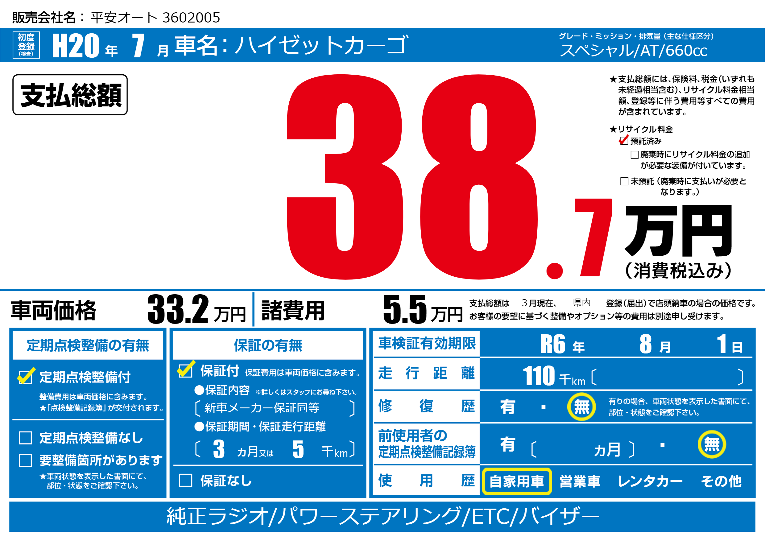 | 走行キロ | 11万km | 初年度登録 | H20年7月 |