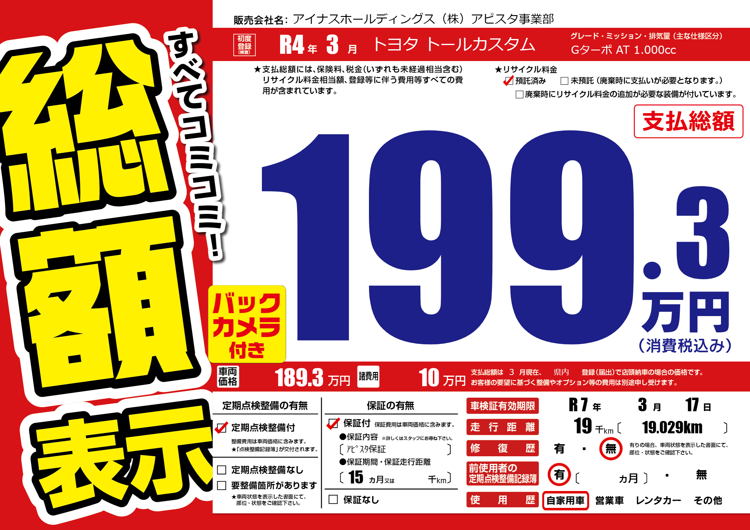 | 車名 | トヨタ トールカスタム | グレード ミッション 排気量 |