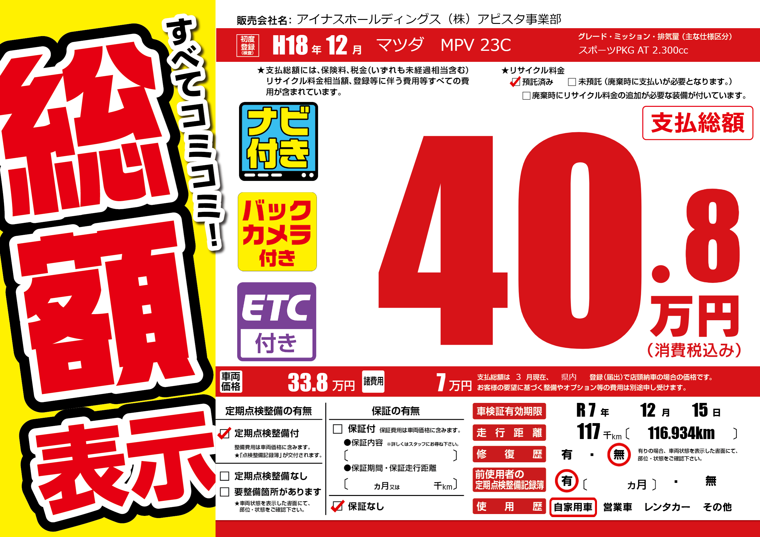 | 車名 | マツダ MPV 23C | グレード ミッション 排気量 |