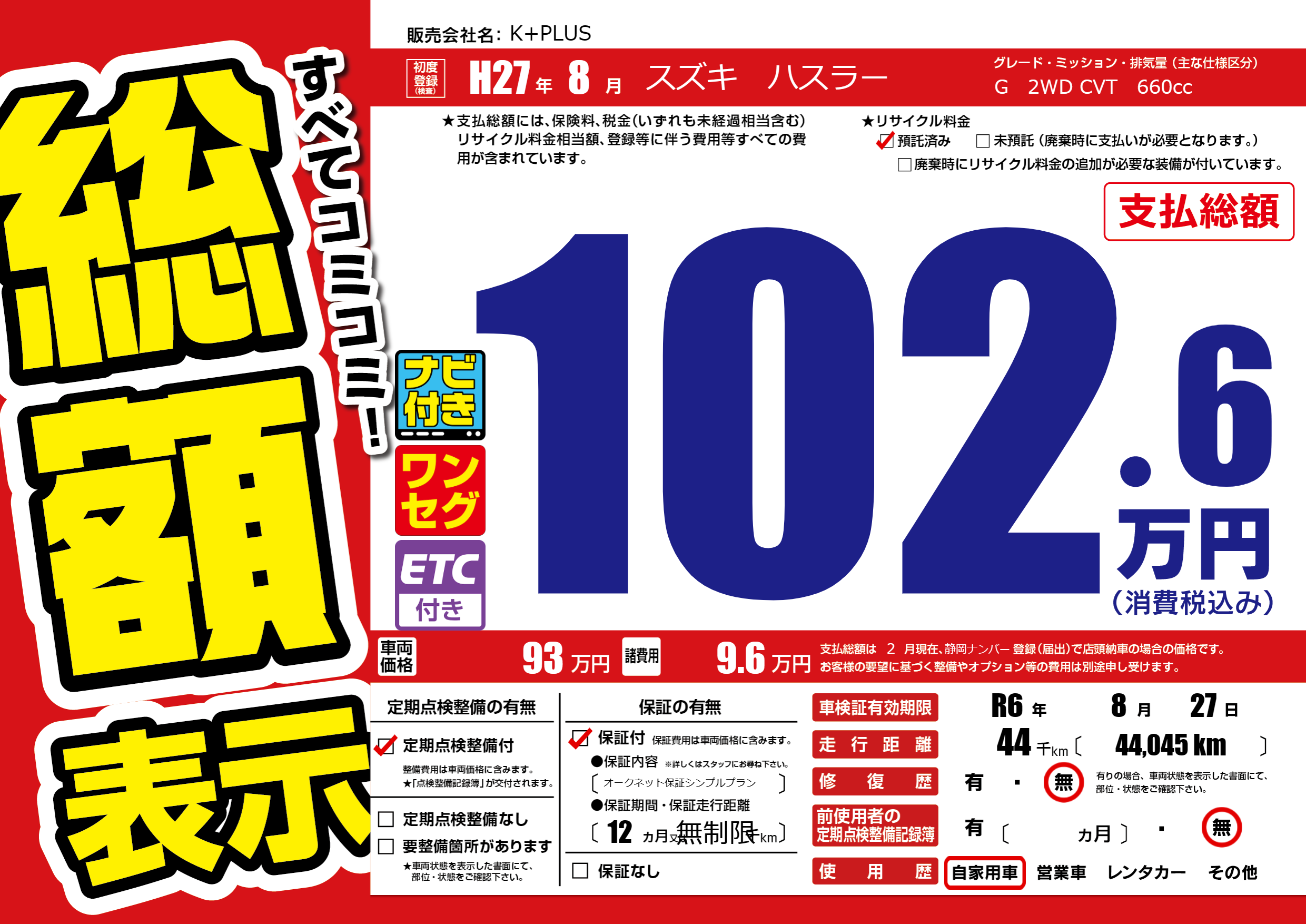 | 車名 | スズキ ハスラー | グレード ミッション 排気量 |