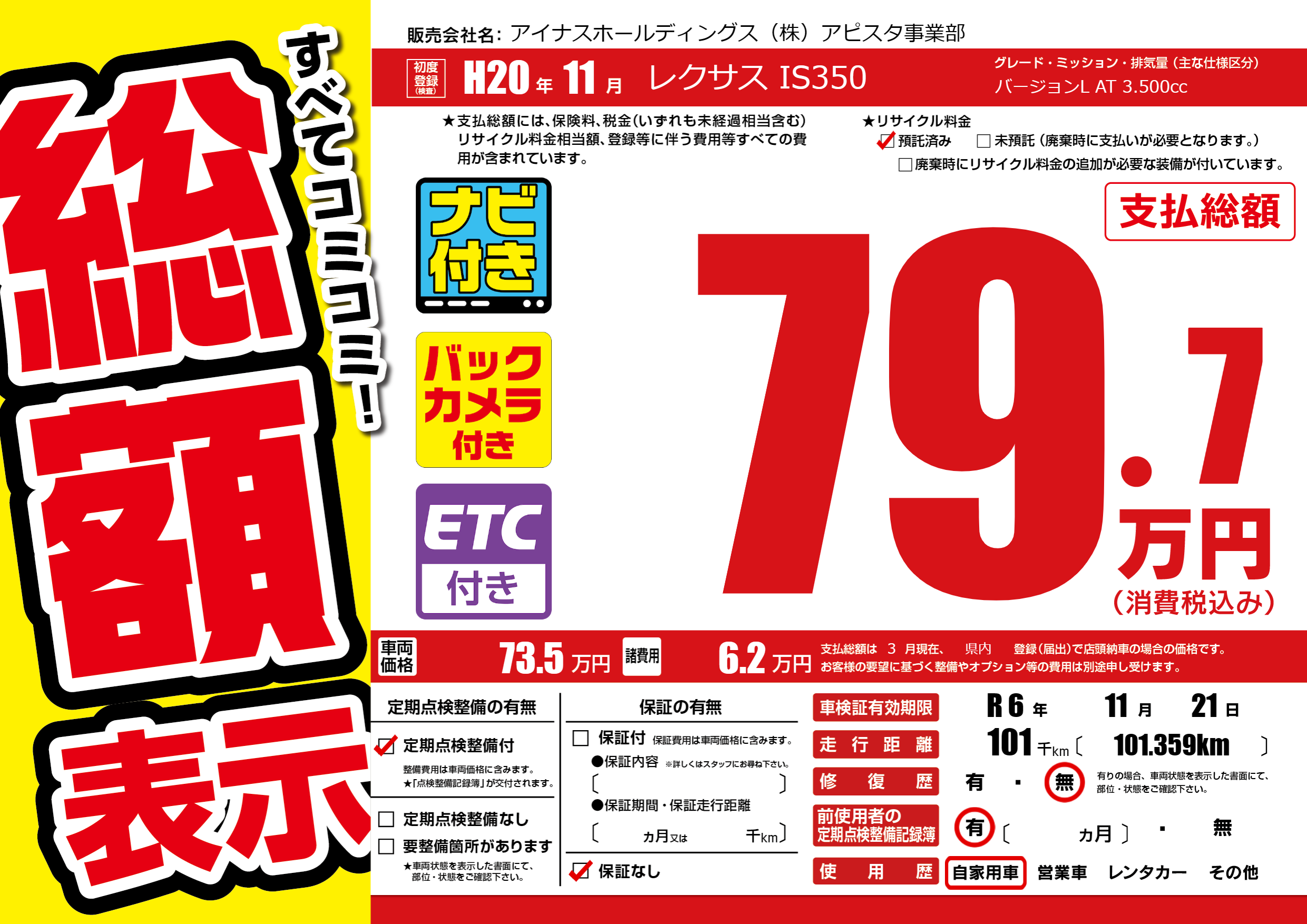 | 車名 | レクサス IS350 | グレード ミッション 排気量 |