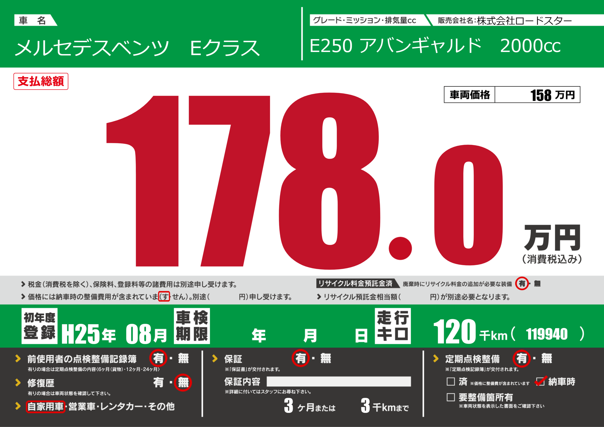 | 車名 | メルセデスベンツ Eクラス | グレード ミッション 排気量 |