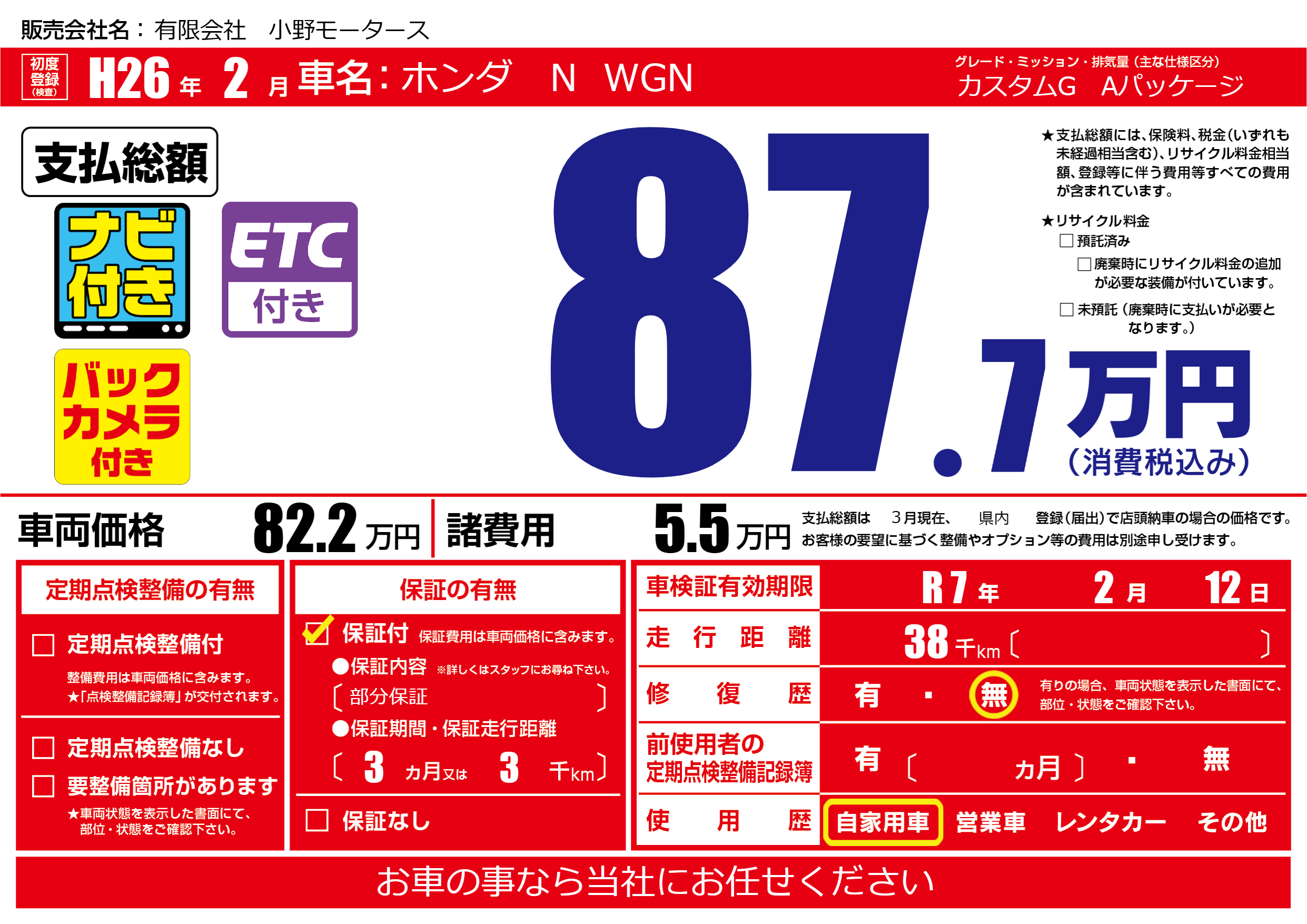 | 走行キロ | 3.8万km | 初年度登録 | H26年2月 |