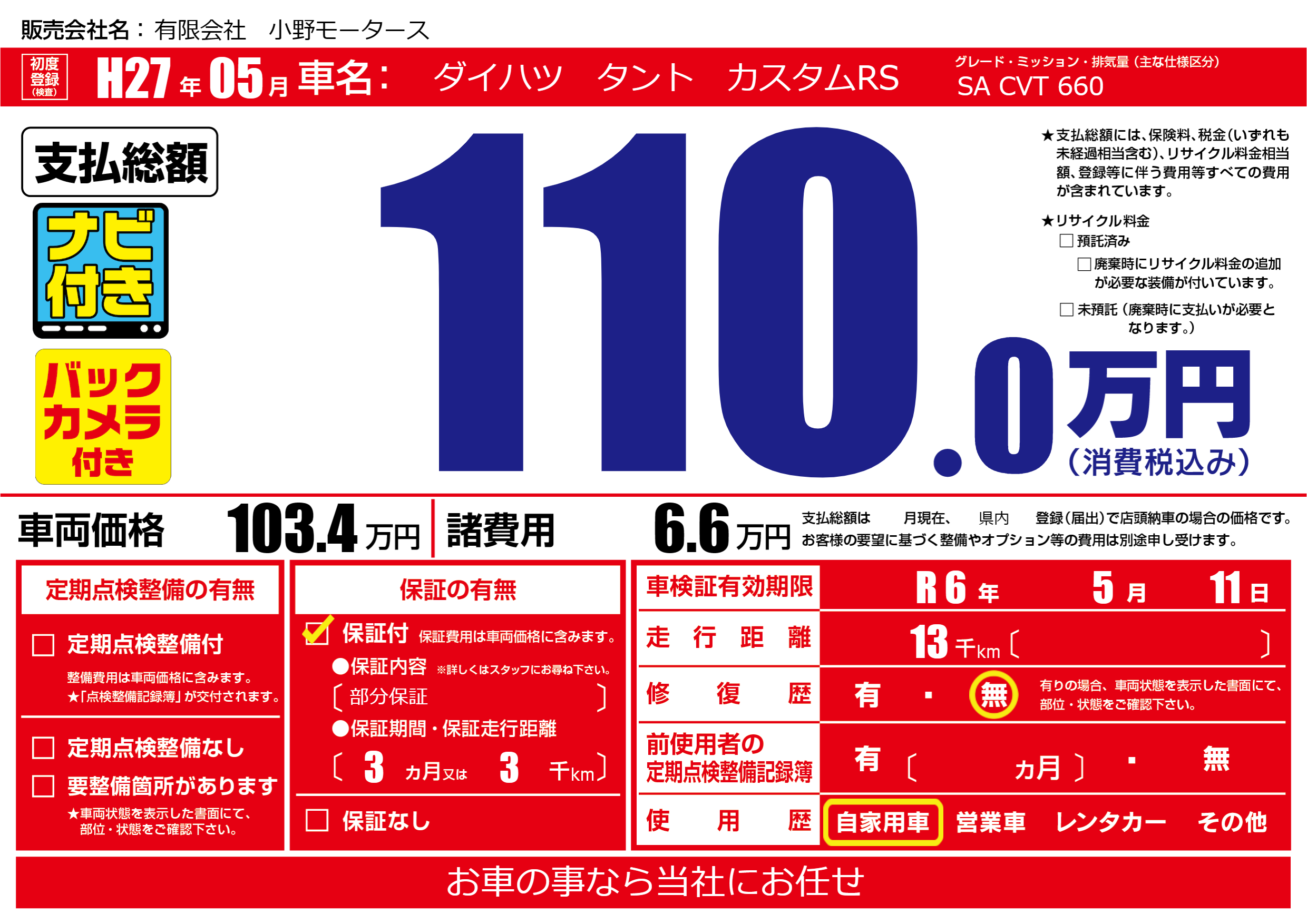| 車名 | ダイハツ タント カスタムRS | グレード ミッション 排気量 |