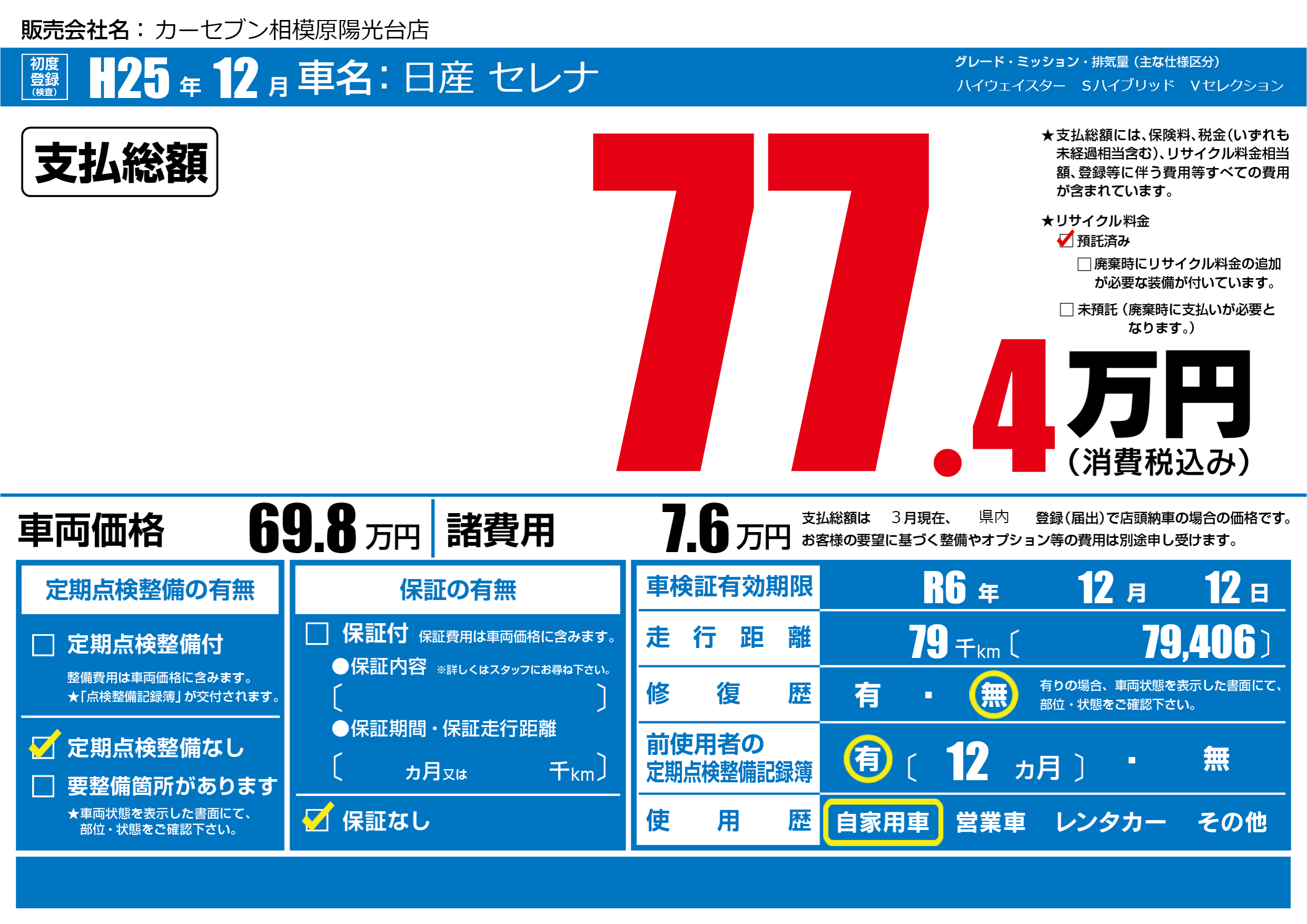 | 車名 | 日産 セレナ | グレード ミッション 排気量 |