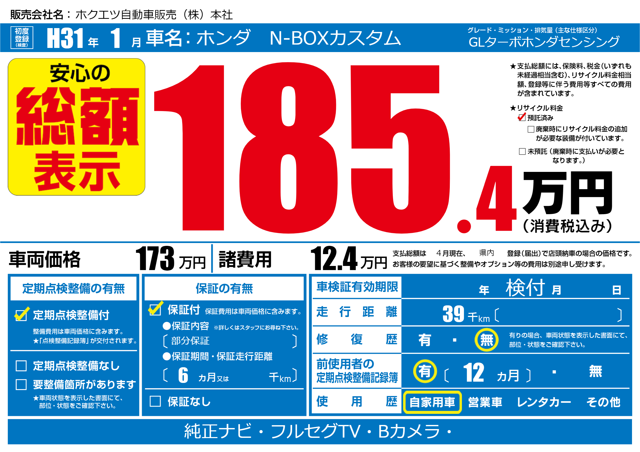| 走行キロ | 3.9万km | 初年度登録 | H31年1月 |