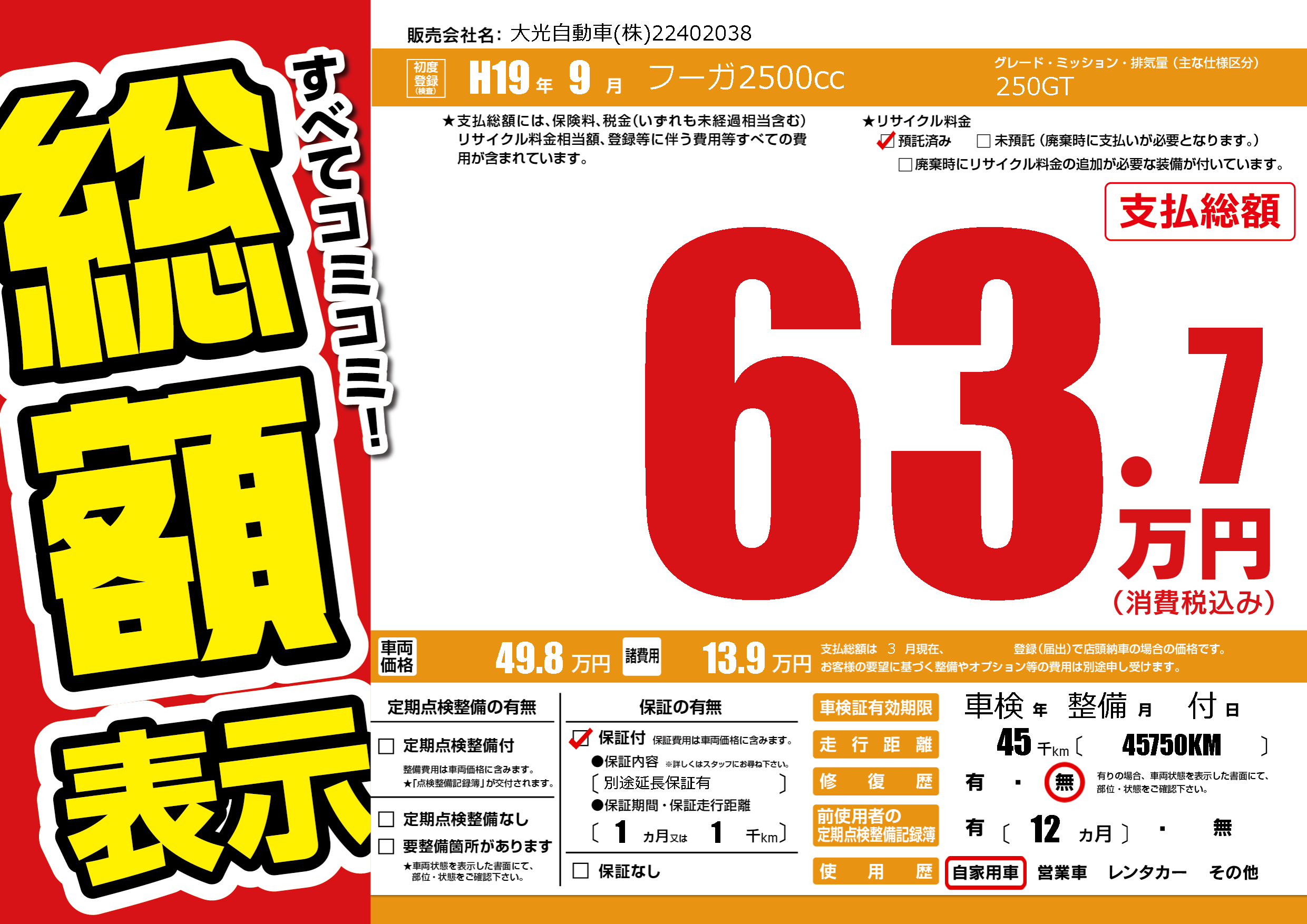 | 走行キロ | 4.5万km | 初年度登録 | H19年9月 |