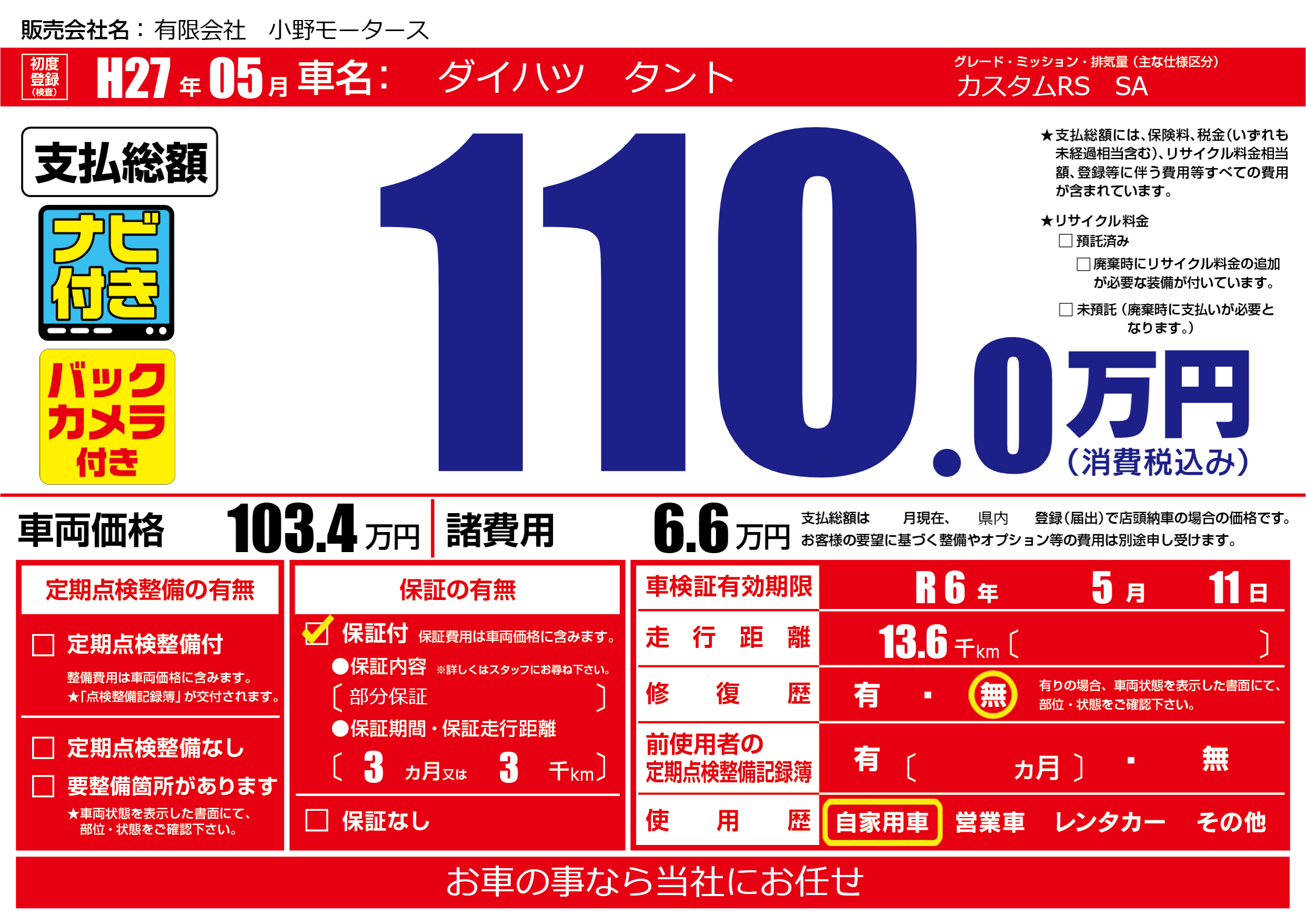 保証付き 保証内容(部分保証) 3ヶ月または(3)千kmまで |