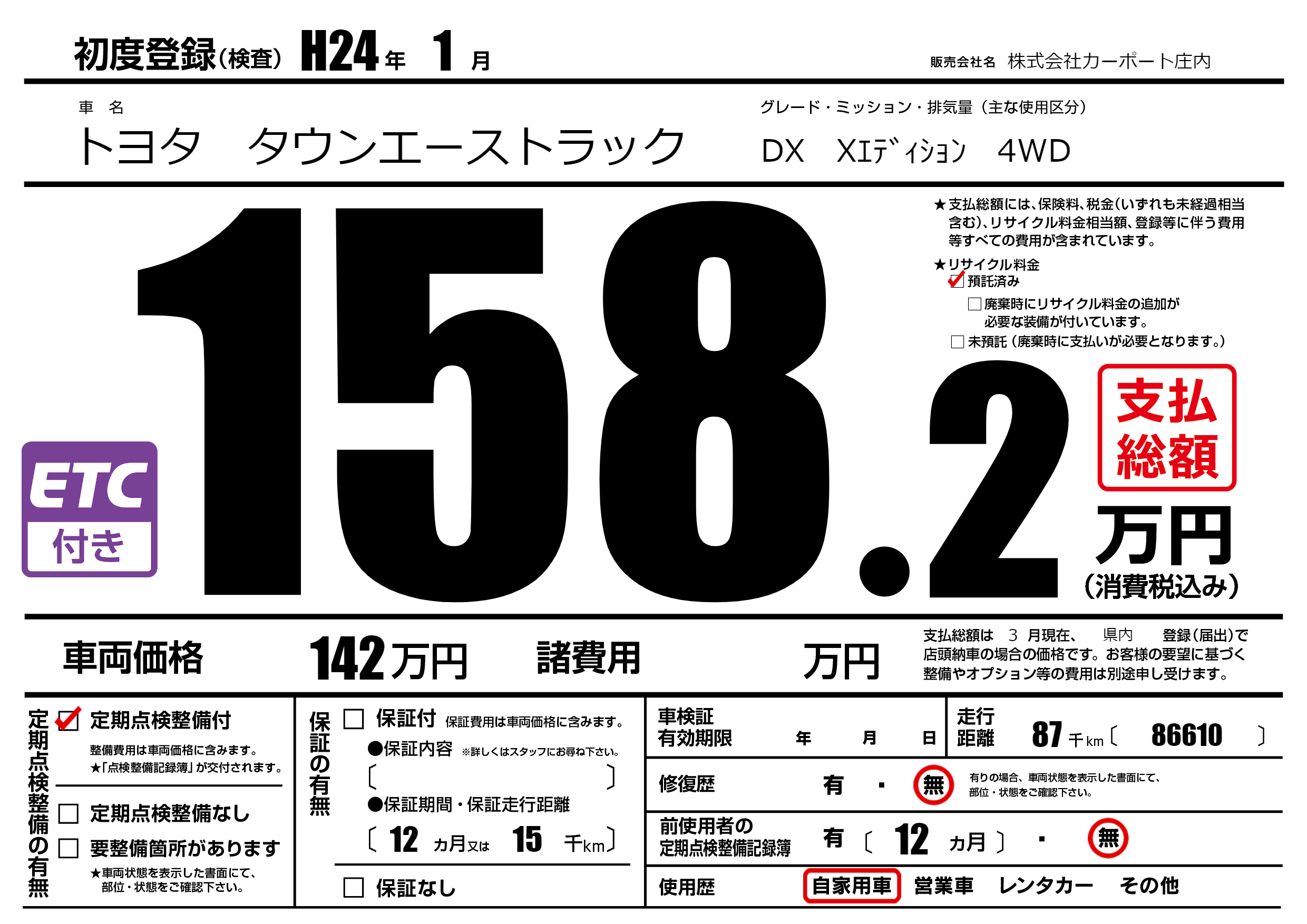 | 車名 | トヨタ タウンエーストラック | グレード ミッション 排気量 |