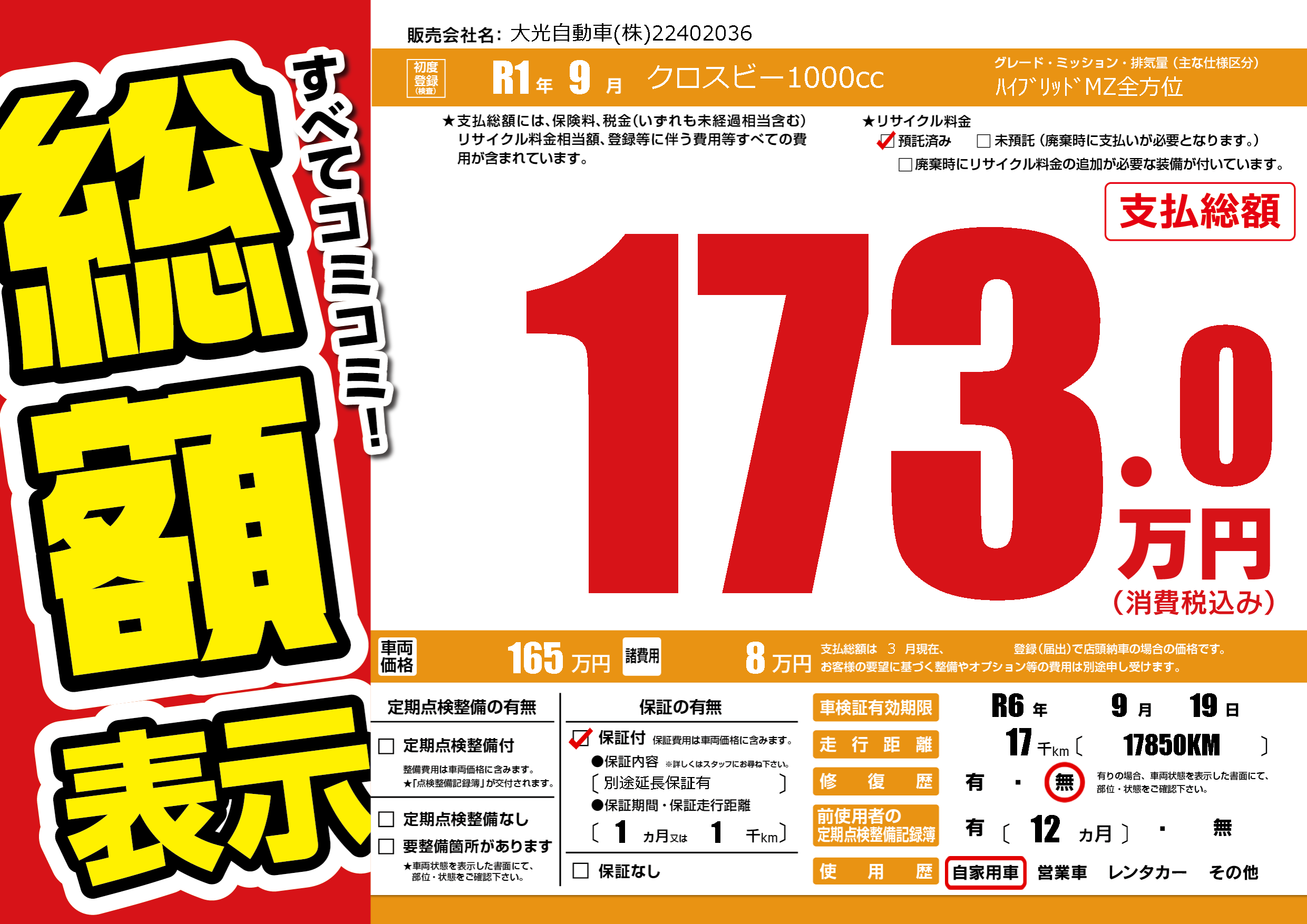 | 車名 | クロスビー1000cc | グレード ミッション 排気量 |