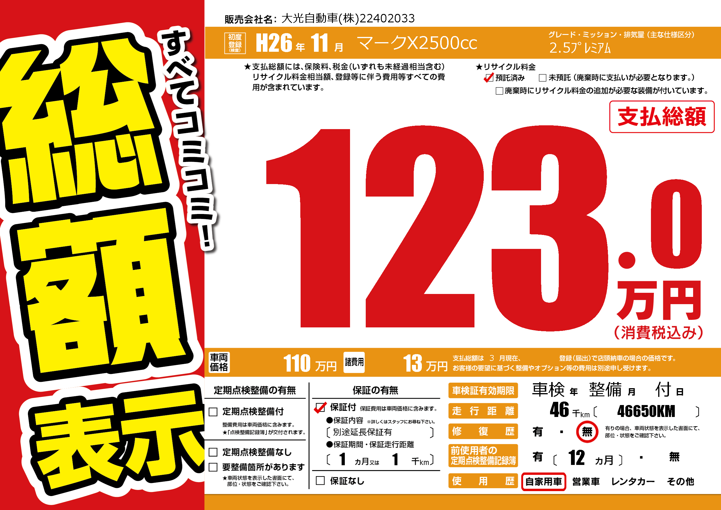 | 車名 | マークX2500cc | グレード ミッション 排気量 |